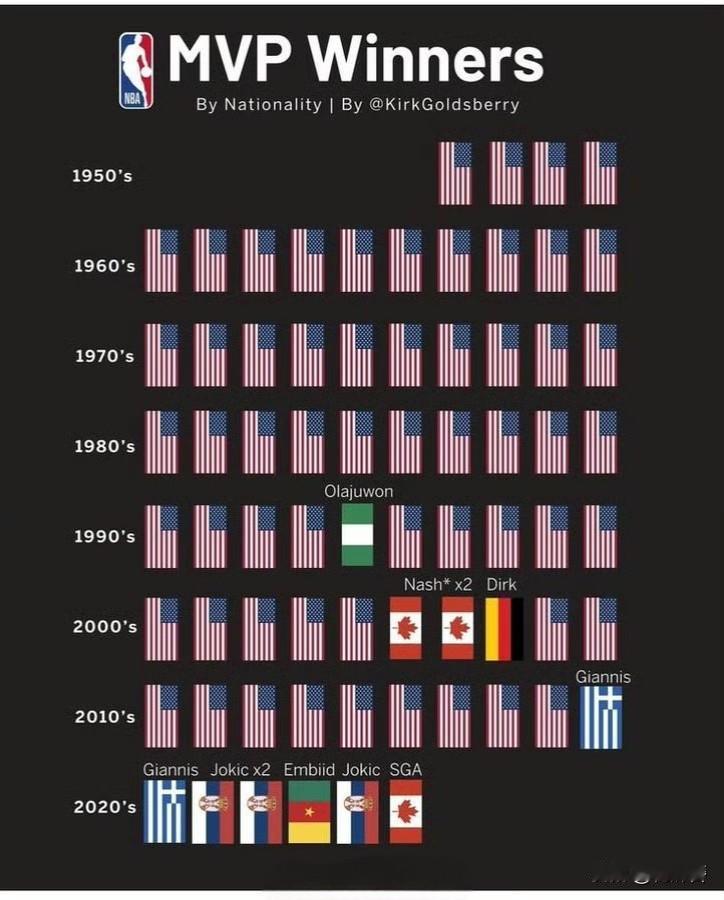 NBA藏了几十年的“老底”,被一张MVP国籍图扒得底朝天!以前总说美国篮球是“老大哥”,现在再看这图,那地位早不是铁板一块了。 1950年代那阵儿,NBA里最牛的MVP奖杯,全是美国球员的。榜单上一眼望去全是星条旗,就跟这块地盘被他们包圆了似的,别人想碰都碰不着。 1990年代出了个变数。尼日利亚的奥拉朱旺把MVP拿了,这是头一回有外国球员站上这个位置。就这么一下,美国篮球那“牢不可破”的架子,第一次有点松了。 到2000年代,情况更不一样。加拿大的纳什、德国的诺维茨基,一个接一个把MVP抱回家。外国球员拿荣誉的越来越多,美国篮球那“老大”的派头,慢慢就撑不住了,裂缝越来越明显。 2010年代往后,就更没美国球员什么“专属福利”了。希腊的字母哥、塞尔维亚的约基奇、喀麦隆的恩比德,这些外国球员轮着拿MVP。现在的MVP榜单上,外国球员占了一半还多,美国球员想再像以前那样垄断,门儿都没有。 这事儿说穿了也简单。NBA后来开始招外国球员,给了他们展示本事的机会。而且现在全世界打篮球的水平都在涨,每个国家都能练出厉害的球员,不再是美国一家说了算。 以前大家都觉得,MVP肯定是美国球员的,没跑儿。可现在看看,外国球员用实力证明,他们一点不比美国球员差,该拿的荣誉照样拿。 美国篮球再也不能像以前那样“说一不二”了,“老大”的位置坐得越来越不稳。这种变化其实挺好,大家一起比着来,篮球比赛才好看,更多有本事的球员也能被大伙儿看见。