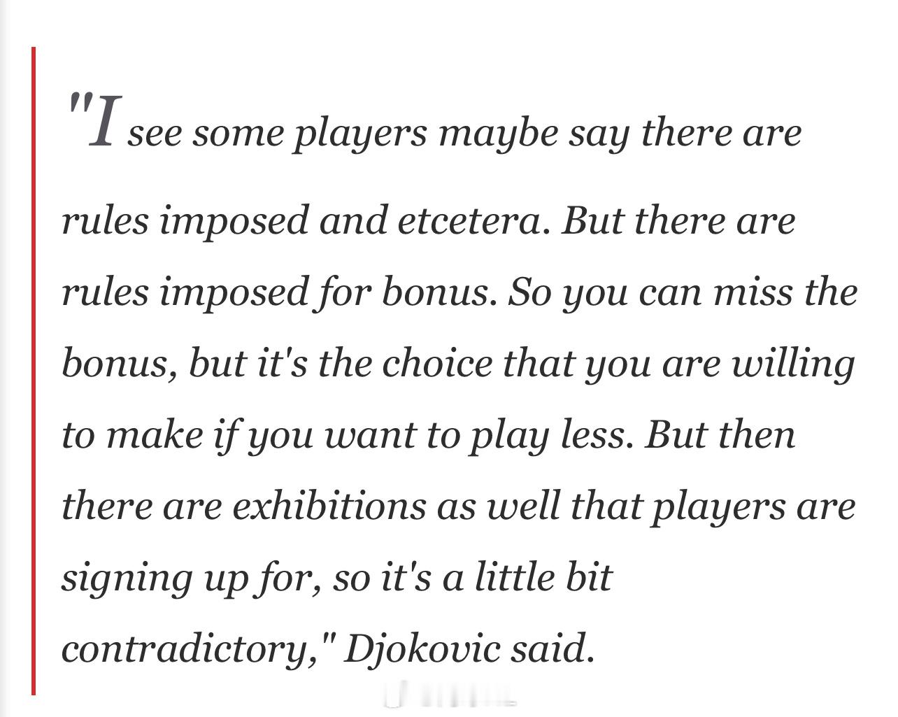 “我看到有些球员可能会说存在一些强制规定之类的。但这些规定是为了奖金而设立的。如果你想减少参赛次数,你可以放弃奖金,这是你愿意做出的选择。但其中还有球员报名参加了表演赛,这就有点矛盾了。”