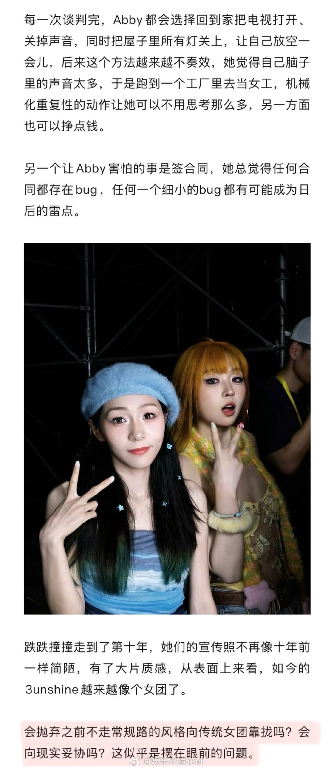 3unshine回应解散危机 3unshine说组合缺一首大爆曲 没有想到当年横空出世的3unshine竟然已经十年了!在谈判桌前晕头转向,签合同怕埋雷…3unshine的十年满是“硬着头皮上”的狼狈。但她们毫无遗憾,只缺一首大爆曲:“要让所有人知道,我们不是靠八卦活十年,是靠敢和现实死磕的劲儿。”