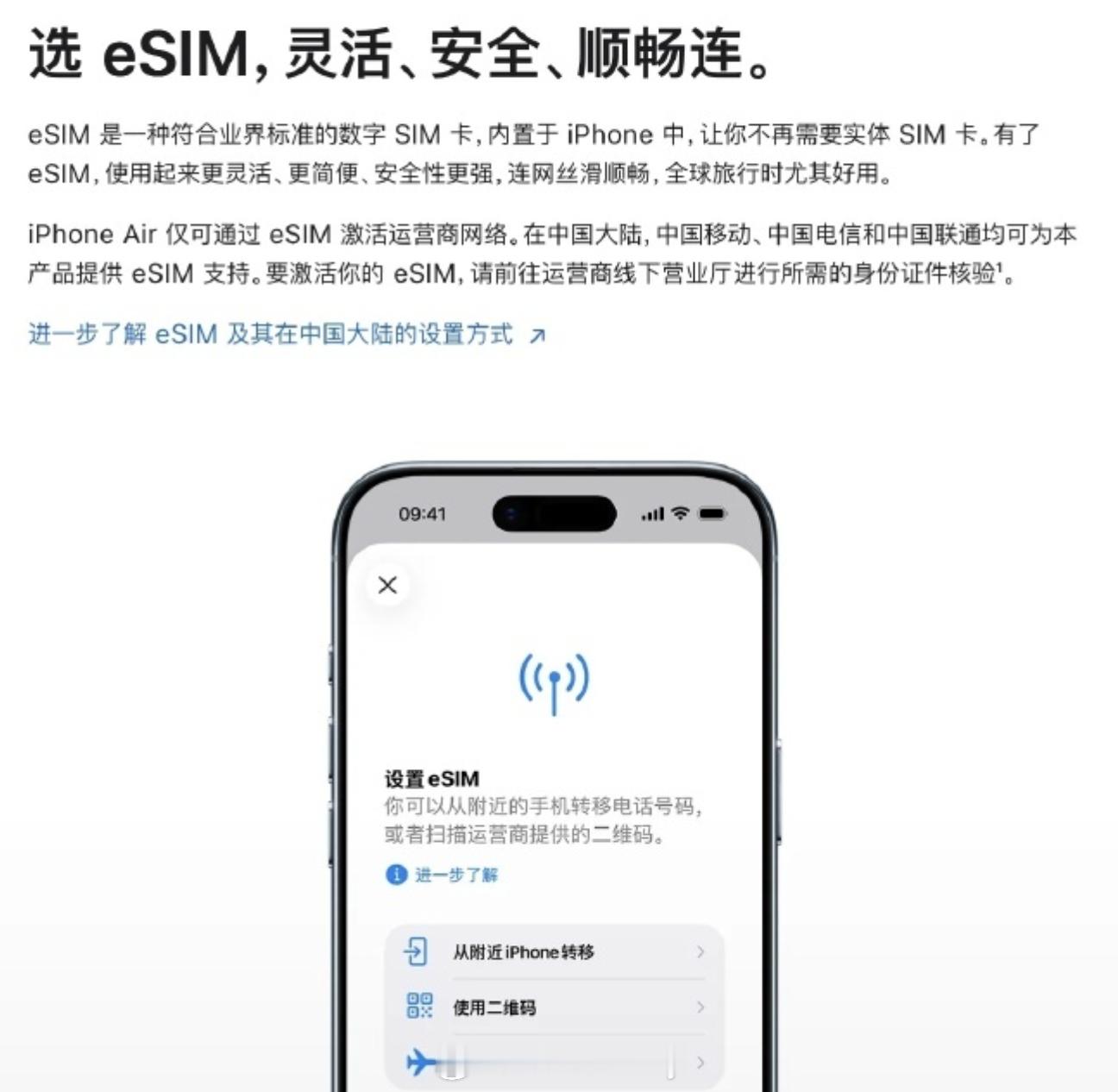 苹果官网确认iPhoneAir非合约机 运营商齐全我觉得这事就好办,看了一下官方提到的运营商中国大陆,中国移动、中国电信和中国联通均可为本产品提供 eSIM 支持,我觉得Air作为双持党来说是一个非常好的选择!