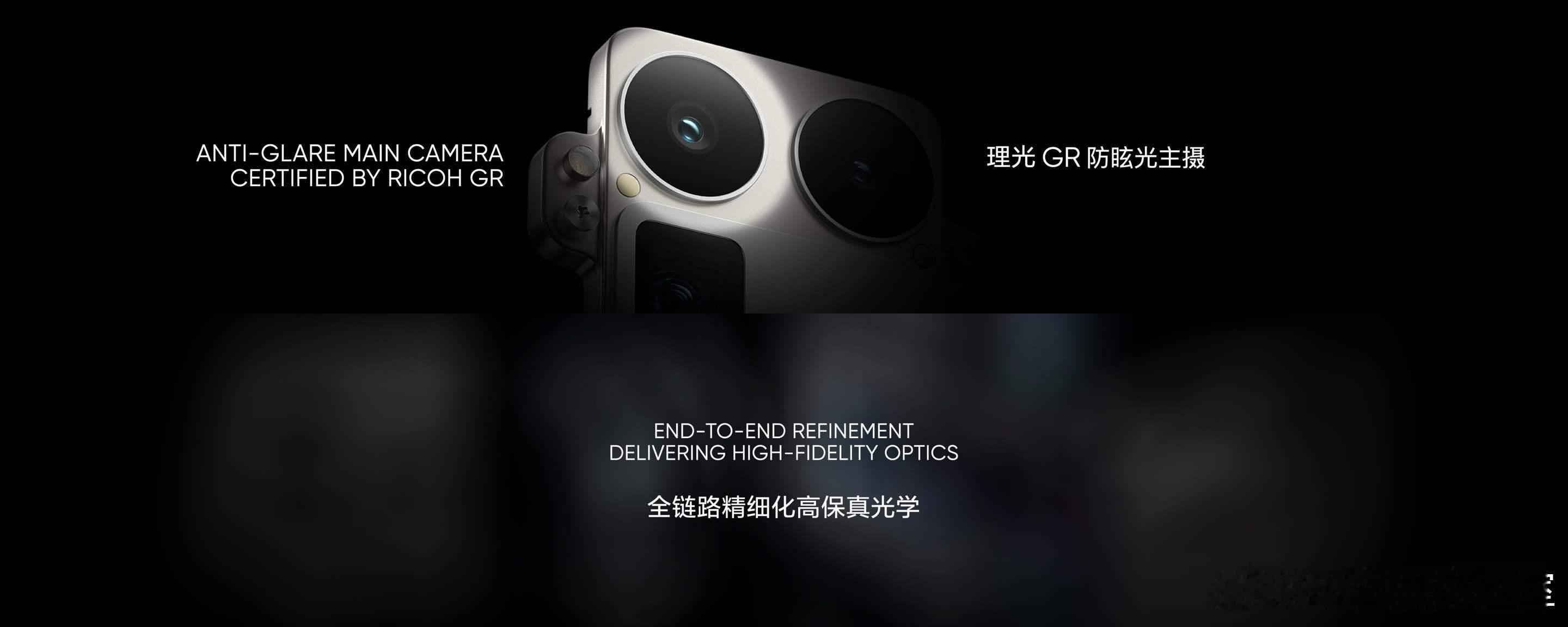 真我联合理光GR定制理光GR防眩光主摄,通过理光GR光学验收中包括眩光控制、解析力、畸变率、色差等数百项测试,还原最纯粹、最真实的光影。
