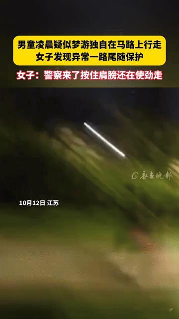 男童凌晨梦游独走马路,女子一路尾随保护!家长该警惕什么? 凌晨的马路边,一个男童鞋都走掉了还在机械地行走,旁边一位女子一路骑车跟随,不停喊着“有车,慢一点”……这不是剧本,是江苏真实发生的一幕。 10月12日,这名男童疑似梦游,独自在马路上走了一整晚。附近出摊的女子发现后,担心他有危险,一路骑车尾随保护,还报了警。即便警察来了按住他肩膀,他仍在使劲往前走。 家里有孩子的家长,是否了解梦游对孩子的潜在风险?遇到这种情况该如何科学处理?如果你撞见这样的场景,会像这位女子一样伸出援手吗?关于儿童梦游问题,你有什么想说的?