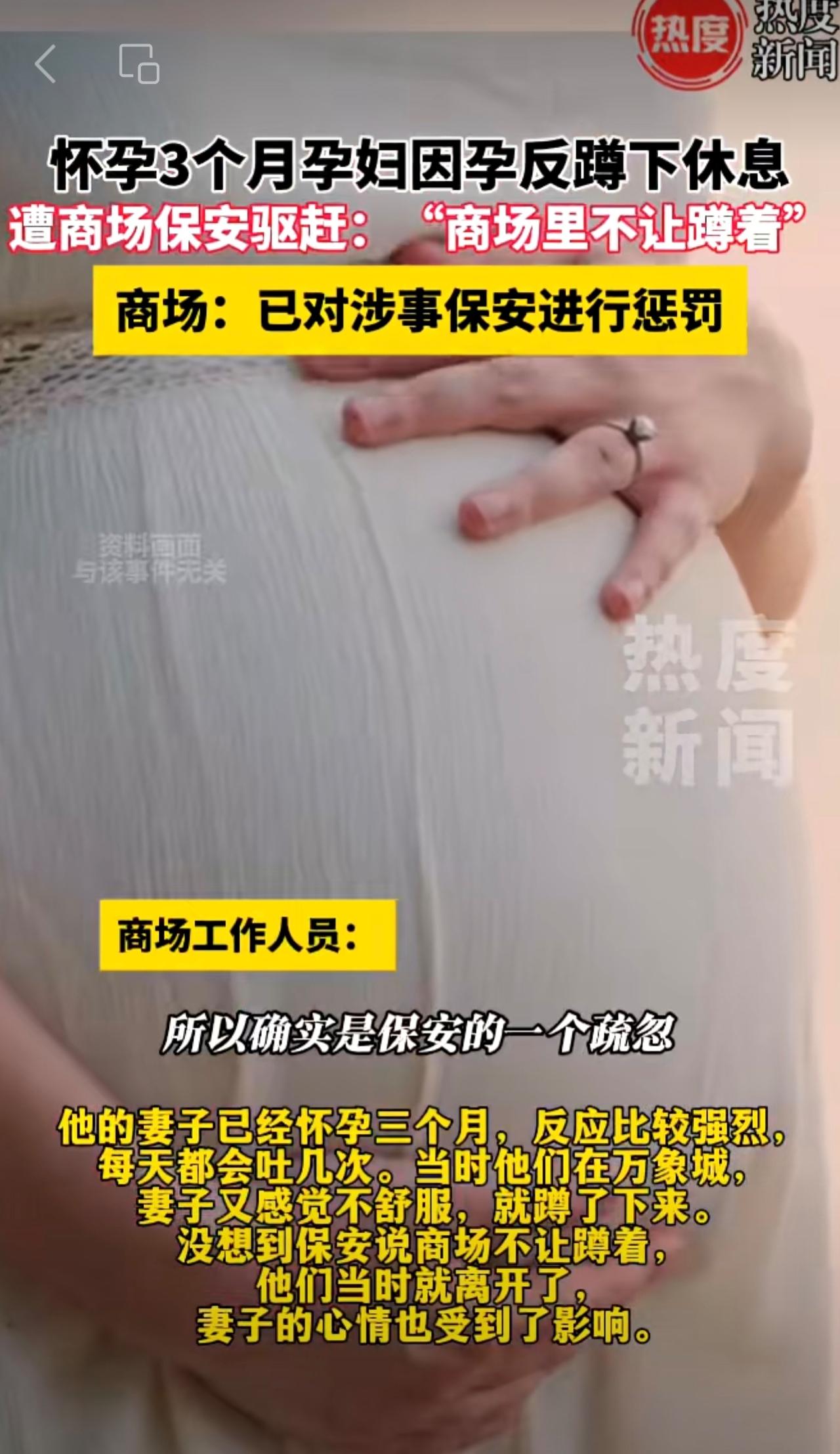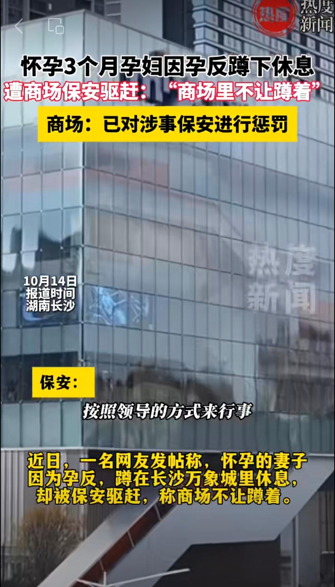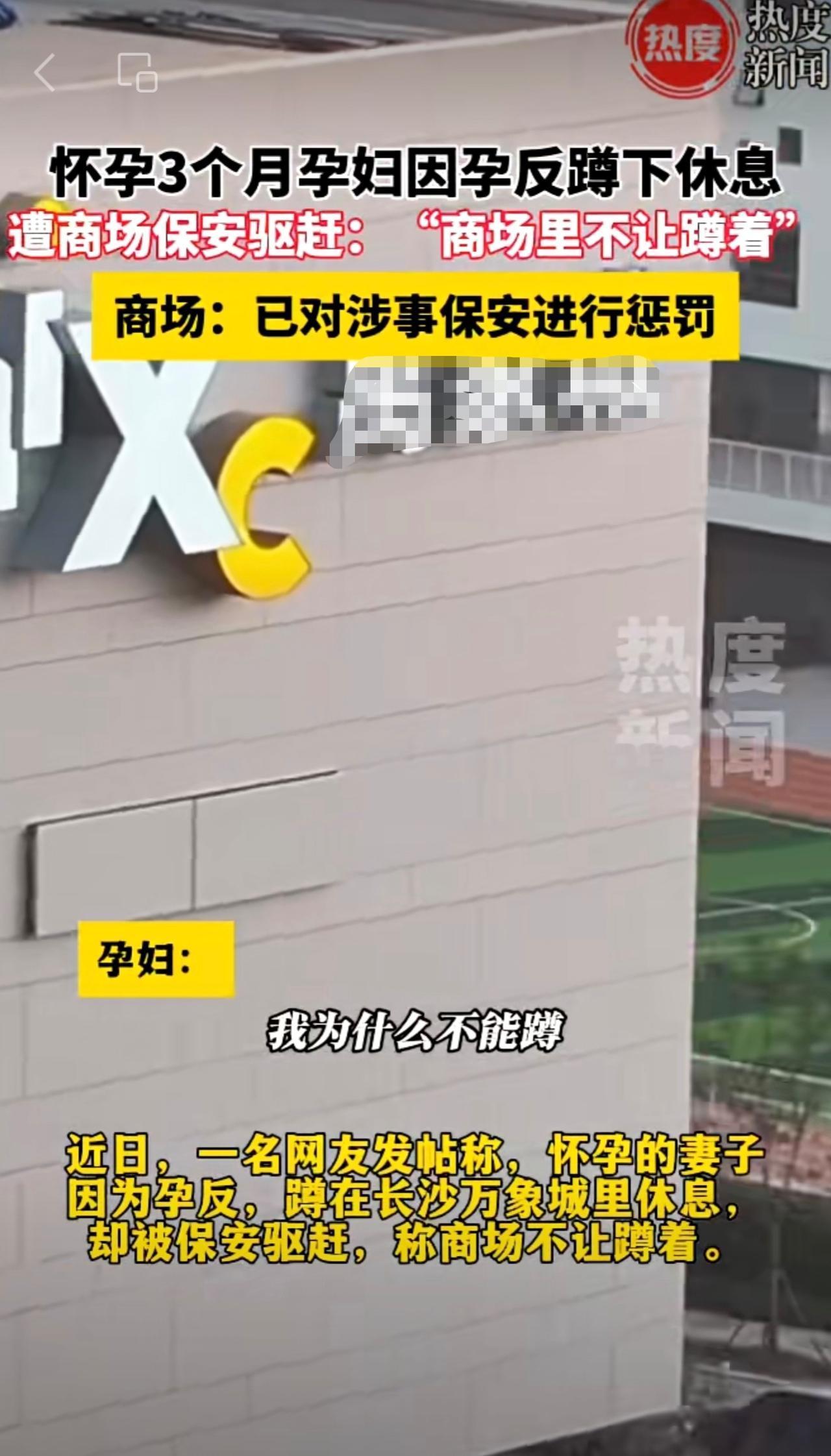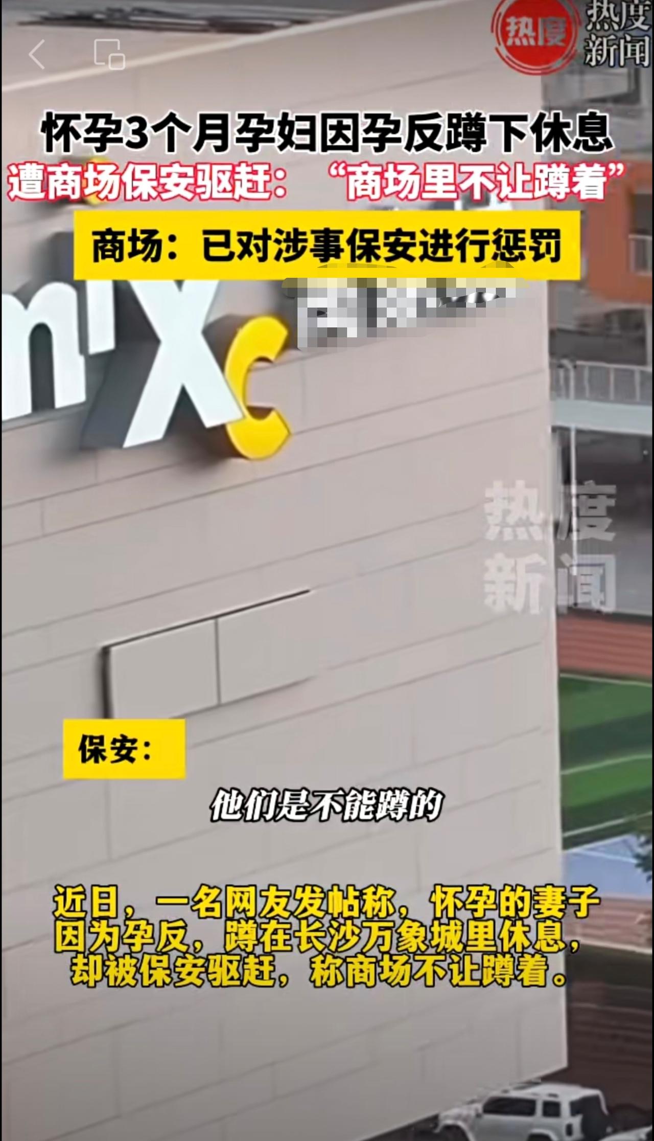 近日,一名网友发帖称,怀孕的妻子因为孕反,蹲在长沙万象城里休息,却被保安驱赶,称