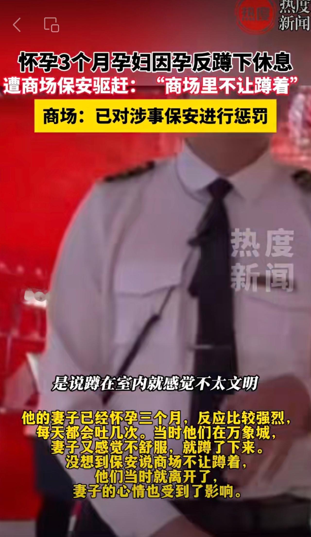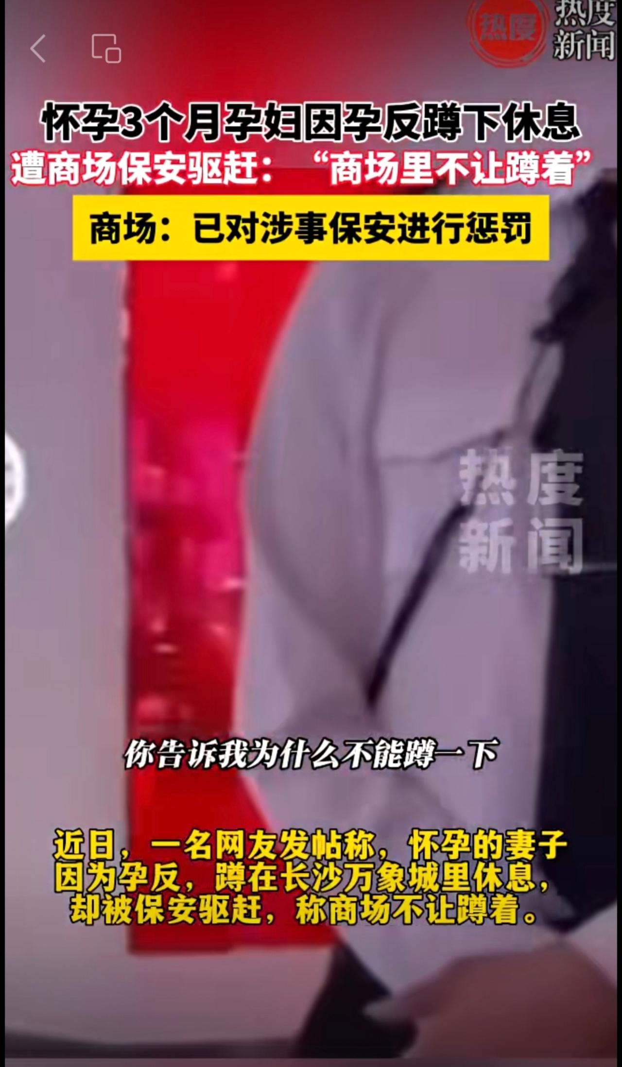 近日,一名网友发帖称,怀孕的妻子因为孕反,蹲在长沙万象城里休息,却被保安驱赶,称商场不让蹲着。热点
