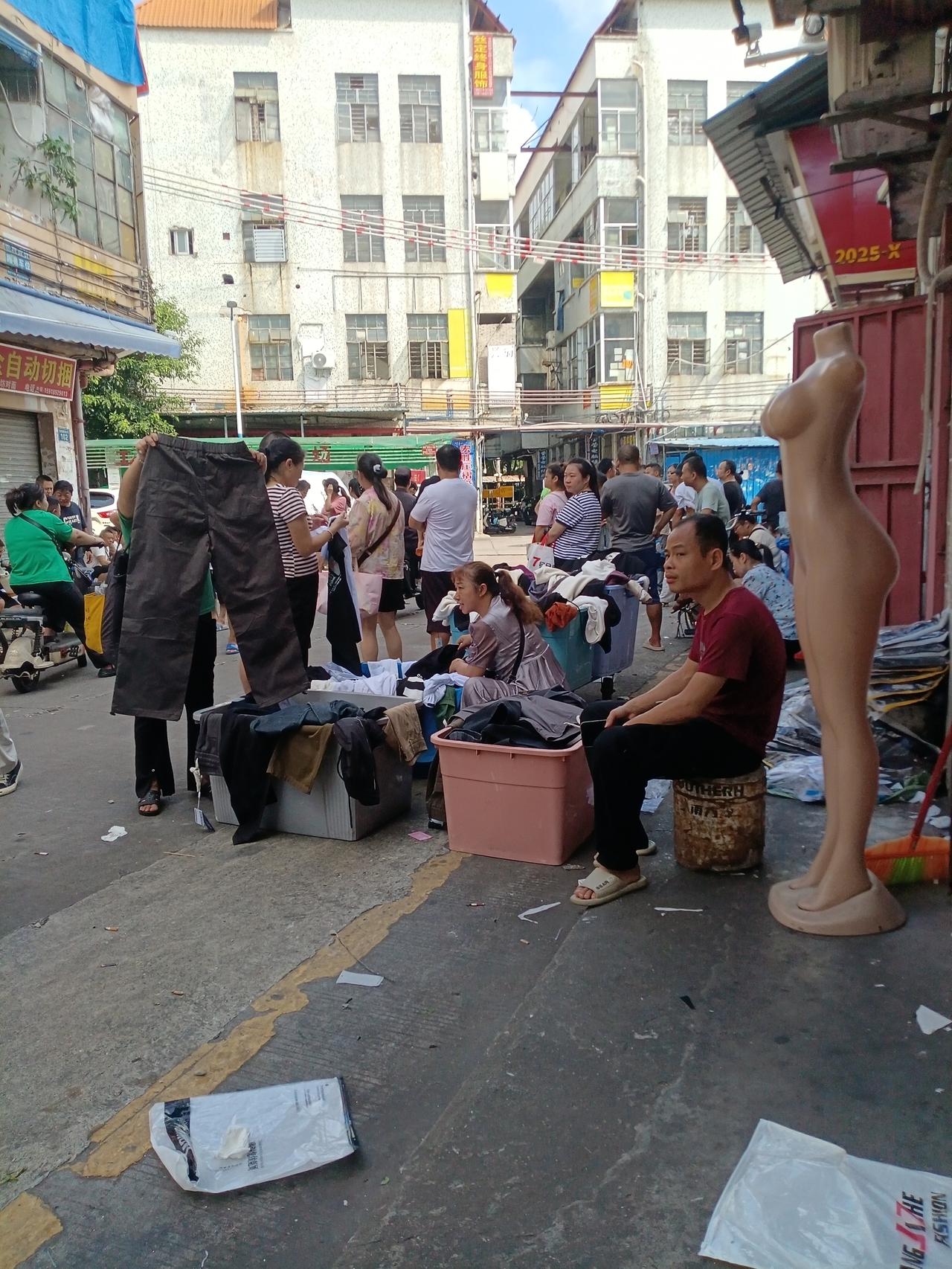 广州海珠区瑞宝村,街道上面,好多人在卖衣服,上衣裤子都有,买的人好少,看的人非常