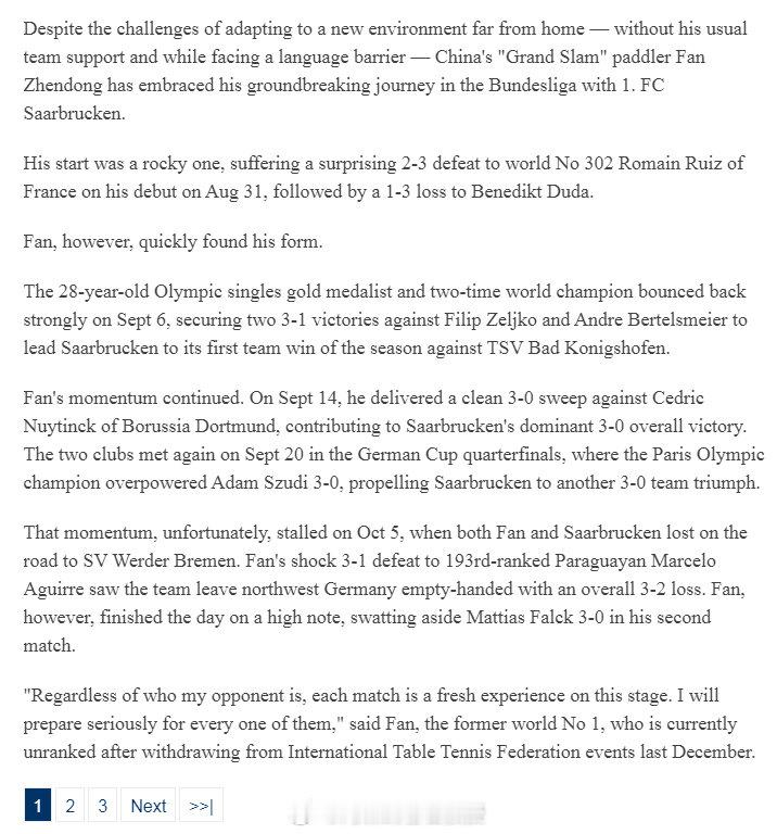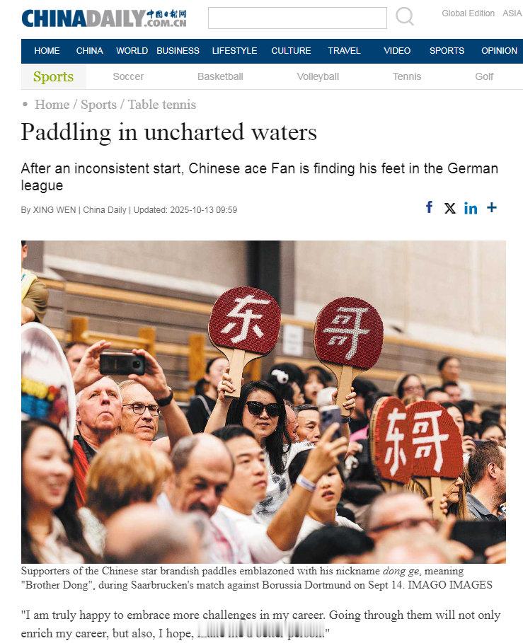 中国日报整版报道樊振东 樊振东登中国日报整版 樊振东登中国日报整版,“在未知的水域里划桨”在经历了不稳定的开局后,中国王牌樊振东德国联赛中找到了自己的立足之地,力量源自对体育本身的爱。全运会赛场见,每个赛场见!