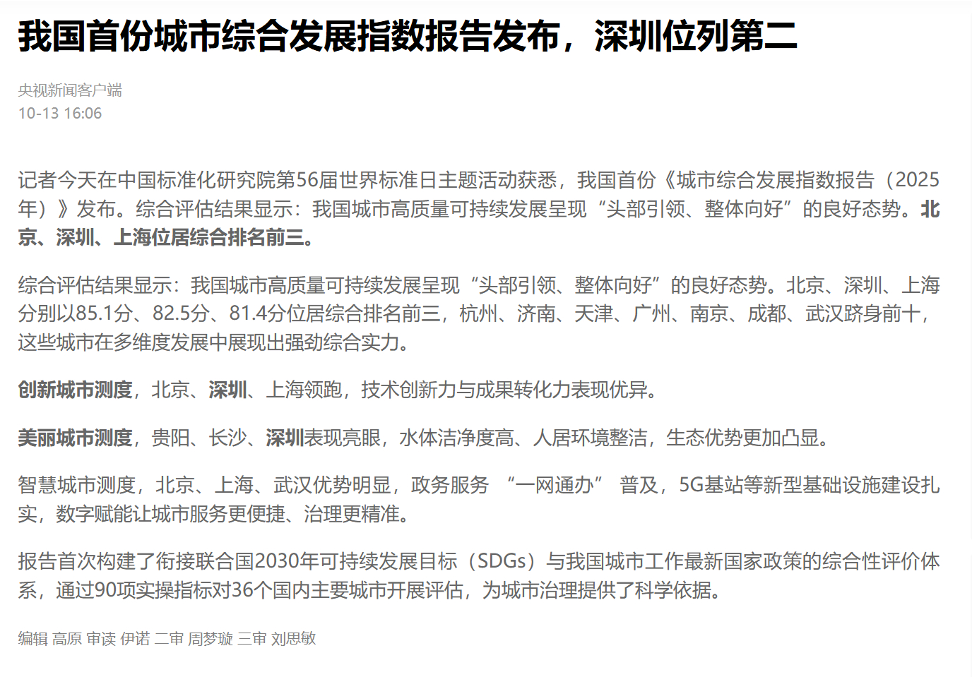 在中国标准化研究院第56届世界标准日主题活动上,我国首份《城市综合发展指数报告(2025年)》发布。综合评估结果显示:我国城市高质量可持续发展呈现“头部引领、整体向好”的良好态势。北京、深圳、上海位居综合排名前三。