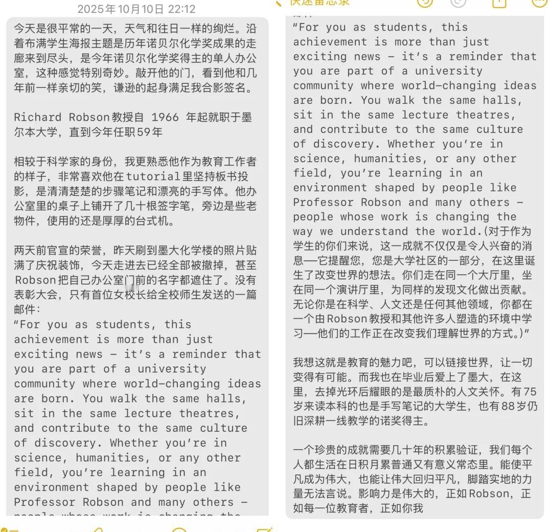 我的tutorial老师是今年诺贝尔化学奖得主 今天是很平常的一天,天气和往日一样的绚烂。沿着布满学生海报主题是历年诺贝尔化学奖成果的走廊来到尽头,是今年诺贝尔化学奖得主的单人办公室,这种感觉特别奇妙。敲开他的门,看到他和几年前一样亲切的笑,谦逊的起身满足我合影签名。 Richard Robson教授自 1966 年起就职于墨尔本大学,直到今年任职59年。相较于科学家的身份,我更熟悉他作为教育工作者的样子,非常喜欢他在tutorial里坚持板书投影,是清清楚楚的步骤笔记和漂亮的手写体。他办公室里的桌子上铺开了几十根签字笔,旁边是些老物件,使用的还是厚厚的台式机。 两天前官宣的荣誉,昨天刷到墨大化学楼的照片贴满了庆祝装饰,今天走进去已经全部被撤掉,甚至Robson把自己办公室门前的名字都遮住了。没有表彰大会,只有首位女校长给全校师生发送的一篇邮件(p5p6) 我想这就是教育的魅力吧,可以链接世界,让一切变得有可能。而我也在毕业后爱上了墨大,在这里,去掉光环后耀眼的是最质朴的人文关怀。有75岁来读本科的也是手写笔记的大学生,也有88岁仍旧深耕一线教学的诺奖得主。 一个珍贵的成就需要几十年的积累验证,我们每个人都生活在日积月累普通又有意义常态里。能使平凡成为伟大,也能让伟大回归平凡,脚踏实地的力量无法言说。影响力是伟大的,正如Robson,正如每一位教育者,正如你我 诺贝尔奖 诺贝尔 诺贝尔化学奖 教育 墨尔本大学 老师不硬核诺奖指南 @科学薯 普通人