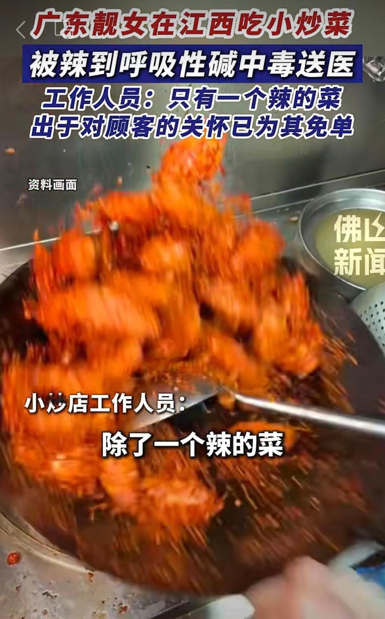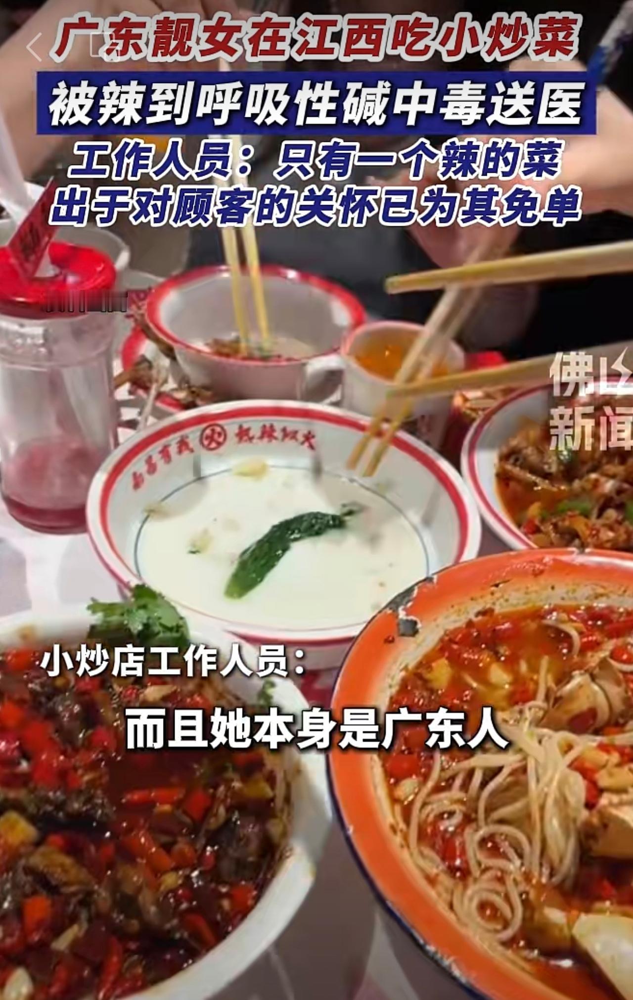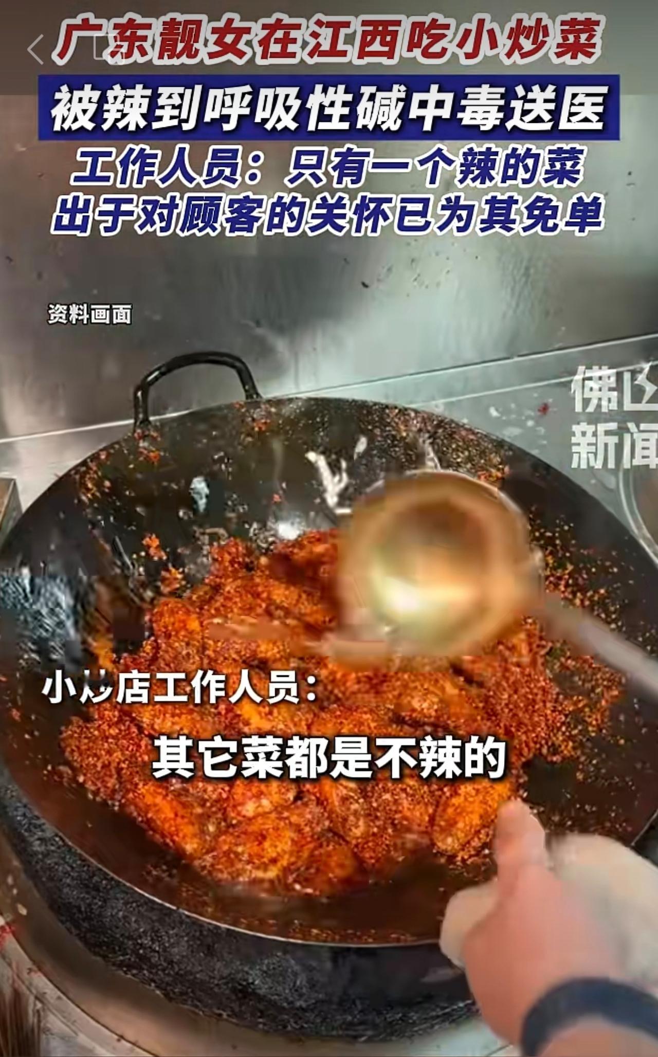广东靓女在江西吃小炒菜,被辣到呼吸性碱中毒送医,工作人员:只有一个辣的菜,出于对
