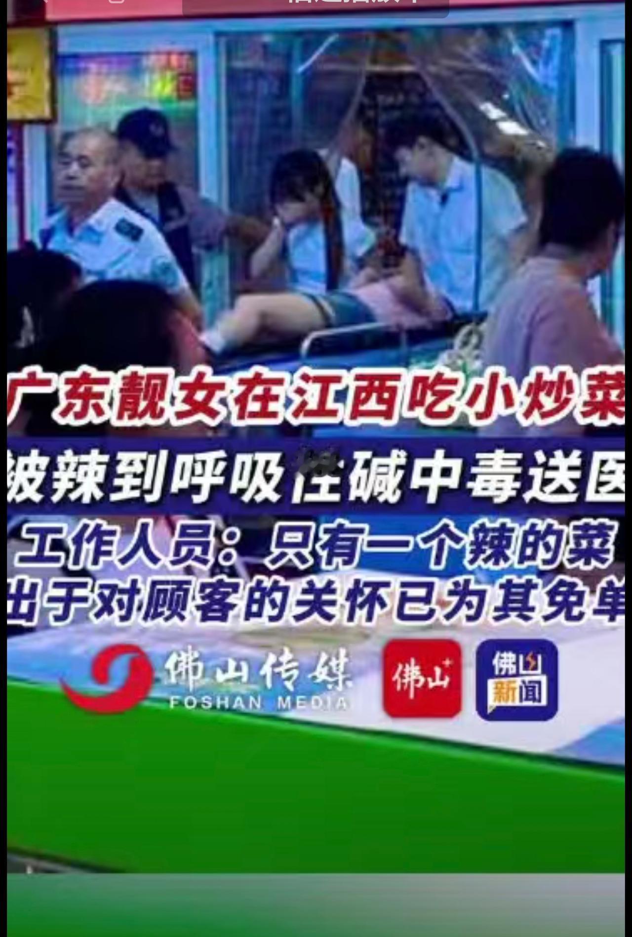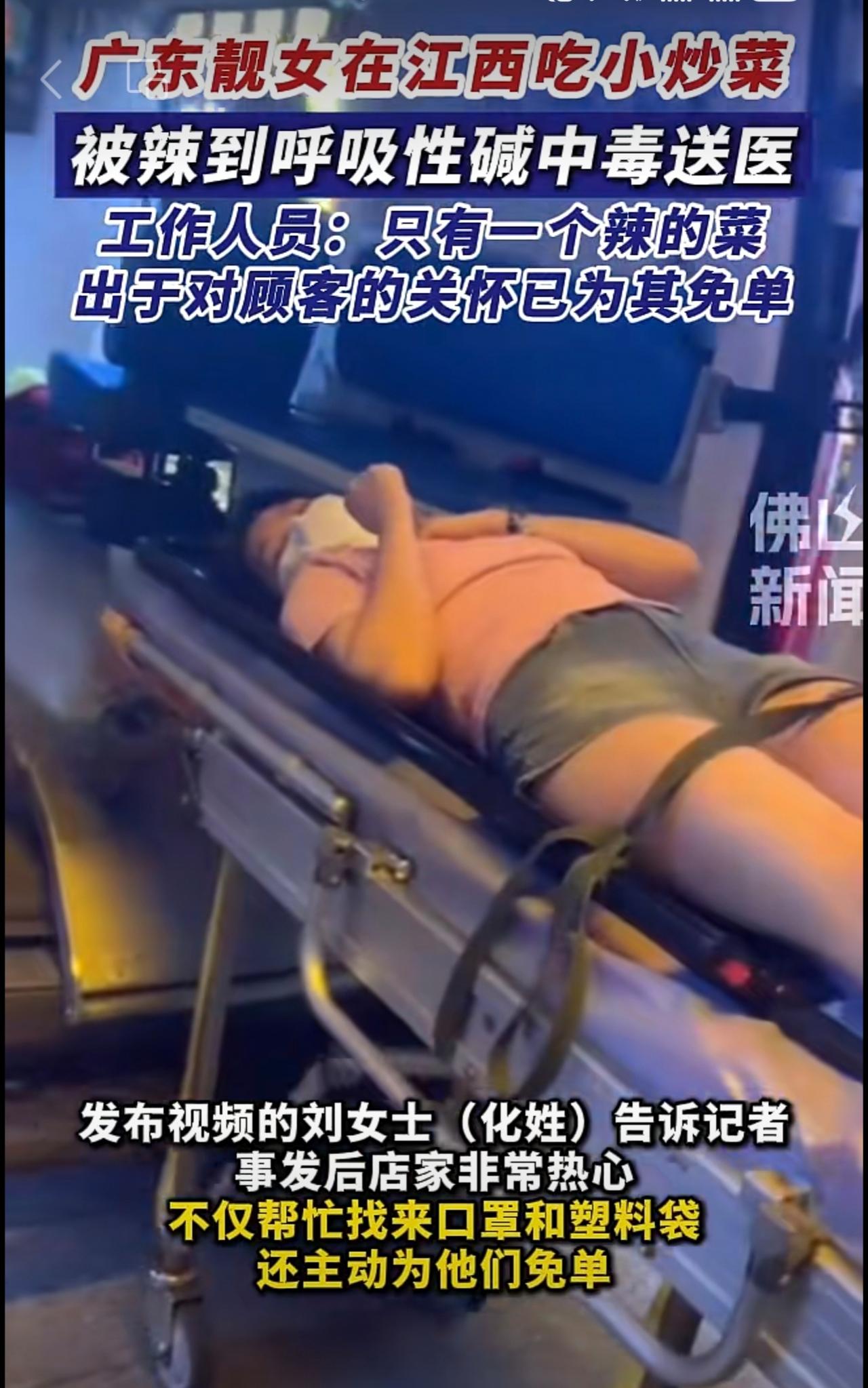 广东靓女在江西吃小炒菜,被辣到呼吸性碱中毒送医,工作人员:只有一个辣的菜,出于对顾客的关怀已为其免单。(编辑:甘乐;责编:王慧君;素材来源:潇湘晨报、有一点好玩)