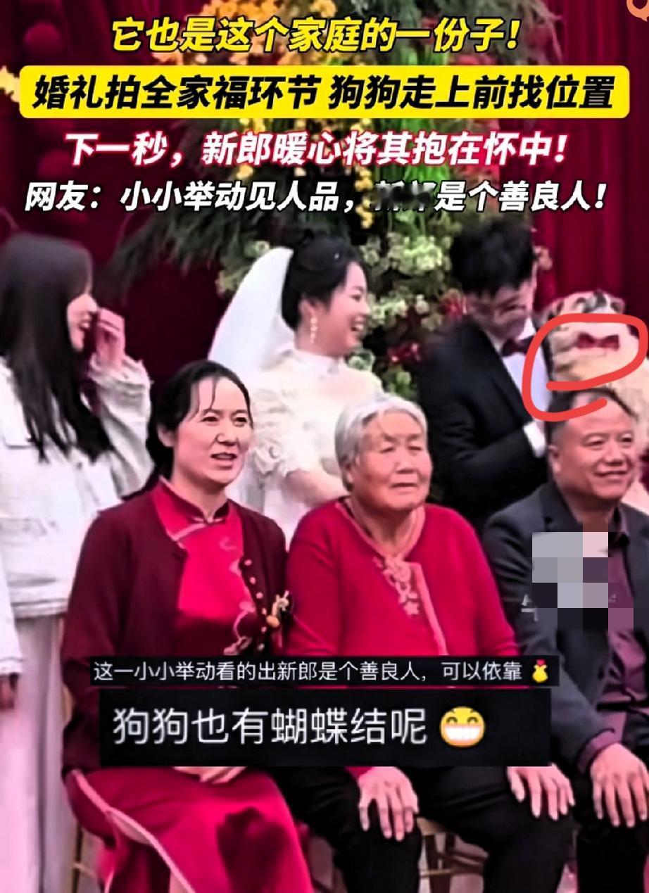 这才是婚礼上最暖的“抢镜”! 山西运城的一对新人在拍全家福时,他们养的小狗突然闯入红毯,新郎没有驱赶,而是笑着把它抱起来一起合影,新娘也满脸笑意地接纳。 这一幕之所以打动人心,是因为它体现了一种平等的家庭观—— 宠物不只是“动物”,而是被真正视为家人的一份子。 很多人嘴上说爱狗,但在重要场合往往会下意识地把宠物排除在外,担心“不体面”或“不吉利”。 而这对新人的举动,恰恰打破了这种陈旧观念。 其实,婚礼上的细节最能反映一个人的真实品格。 新郎的包容和新娘的默契,预示着他们未来生活中也会懂得尊重彼此的喜好和选择。 这样的婚姻,更容易建立在理解和温暖之上。 你觉得婚礼上应该允许宠物参与吗?如果是你,会让自己的宠物出现在重要的家庭照片里吗?