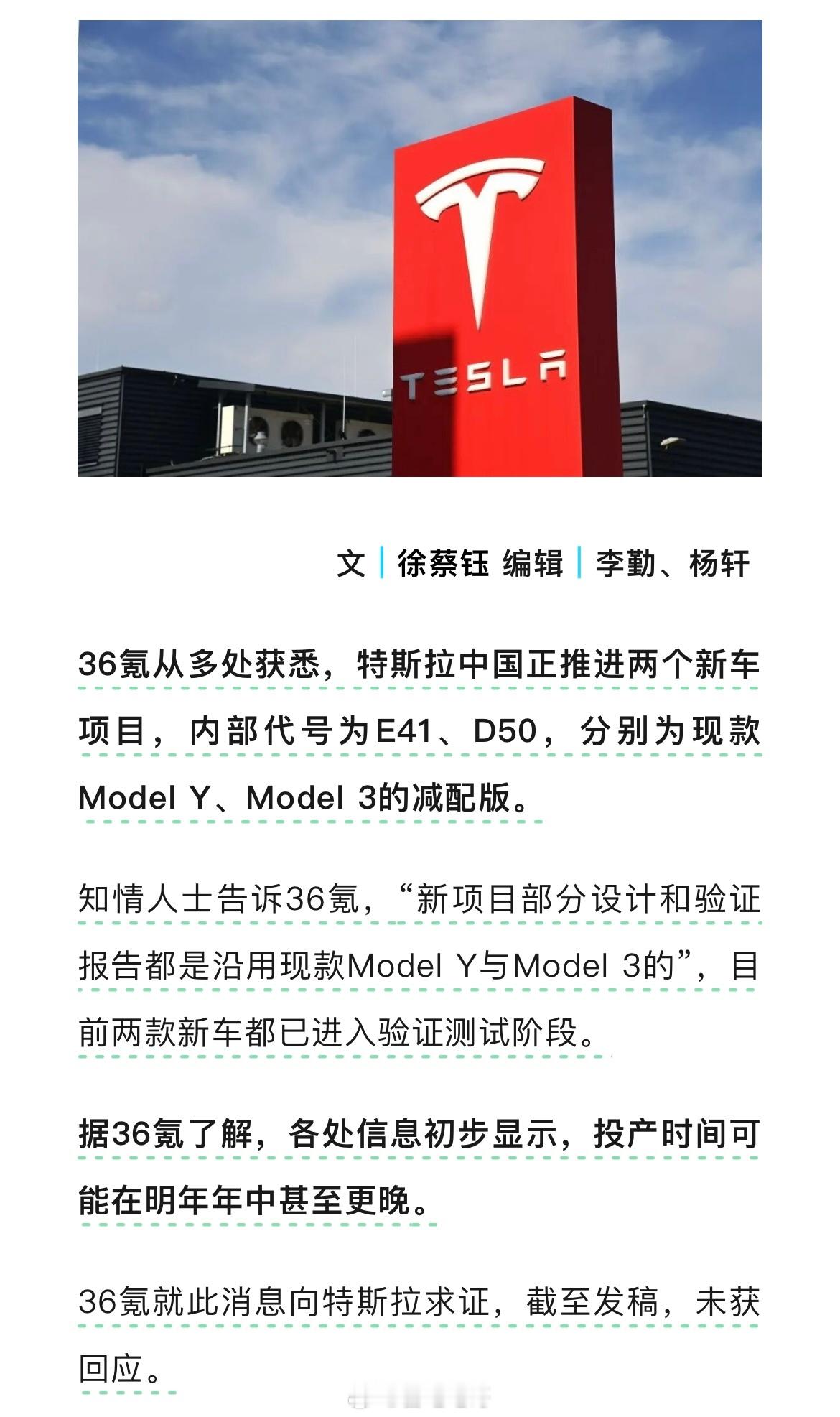 而且据知情人士称“新项目部分设计和验证报告都是沿用现款Model Y与Model 3的”