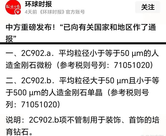 中方严控人造钻石出口,而且这项措施将于11月8日正式生效,许多人可能第一反应是珠宝市场要变天了,但仔细了解才发现,这把“火”真正烧向的其实是半导体产业! 10月9日,中方发布公告,宣布自11月8日起对超硬材料相关物项实施出口管制,并列出了受管制的六类物项,包括不同规格的人造金刚石微粉、单晶、线锯、砂轮以及关键生产和工艺技术。 很多人看到“人造钻石”,第一反应可能是珠宝市场要变天,毕竟培育钻石这两年在饰品领域热度不低,但仔细看公告就会发现,这次管控的重点压根不是装饰用钻石——公告特意注明“装饰用培育钻石不在此列”,真正被纳入管制的,全是工业领域离不开的硬通货。 先说这些超硬材料到底是什么。简单讲,就是硬度能和天然金刚石比肩的特殊材料,主要分为人造金刚石和立方氮化硼两大类,前者更是目前已知最硬的物质,它们可不是实验室里的稀罕品,在河南南阳的超硬材料产业园里,PECVD设备24小时不停运转,提纯后的金刚石粉末装在带追溯二维码的密封罐里,随时准备发往全球工厂。 这次清单里的物项都有明确的技术指标:粒径小于50微米的微粉、线径不足45微米的线锯,正是这些不起眼的工业级超硬材料,直接卡着芯片制造的“咽喉”,半导体芯片的诞生要经过上百道精密工序,每一步都离不开超硬材料的支撑,比如晶圆切割,精度要求到微米级,普通刀具一接触就会碎裂,只能靠金刚石线锯像“切豆腐”一样慢慢加工。 而这次管制的线锯,刚好符合半导体加工的严苛标准:线径≤45μm、金刚石粒径≤8μm,差一点都达不到芯片制造的精度要求,更关键的是EUV光刻机,它的光学元件必须镀上金刚石涂层才能保持稳定性,荷兰阿斯麦的High-NA EUV光刻机根本离不开中国的高纯度金刚石。 还有美国,近99%的人造钻石应用在芯片制造领域,其中77%都来自中国,相当于芯片产业链直接握在别人手里,更尴尬的是美国本土已经30年没有规模化生产工业金刚石了。 上世纪90年代后,他们把产能转移到海外,如今想重新建生产线,从设备采购、工艺调试到稳定量产,至少需要5年时间,远水解不了近渴,戈维尼分析中心的报告更戳中痛点,美国半导体设备供应链里,依赖中国超硬材料的环节多达3000多条,短期内根本找不到替代来源,现在他们一边紧急和印度商量建厂,一边释放战略储备,但储备量撑死只能用6个月,纯属拆东墙补西墙。 至于我们能拿出这样的管控底气,并非偶然,而是中国在超硬材料领域几十年技术积累的结果,西安交通大学研发的设备,能稳定生产高纯度金刚石薄膜;国产MPCVD设备(微波等离子体化学气相沉积设备)已经占据全球一半市场份额;从单晶生产到磨具加工的全产业链,早就实现了自主可控。 更直观的是产业规模,全国4.15万家超硬材料相关企业、3万多项有效发明专利,这些数字才是管制政策的硬后盾,而且政策也留了灵活空间,合法合规的申请可获许可,既守住了产业安全底线,又没把合作的路堵死,比单纯的禁令高明得多。 随着11月8日生效日期越来越近,估计不少半导体厂商得连夜盘点库存了,毕竟比起钻戒涨价这种小烦恼,芯片断供才是真的要命,这事儿也给全球产业链敲了个警钟:别总想着在高端领域搞垄断,基础材料的卡脖子可能更致命,而中国已经在这个关键领域,稳稳握住了主动权。