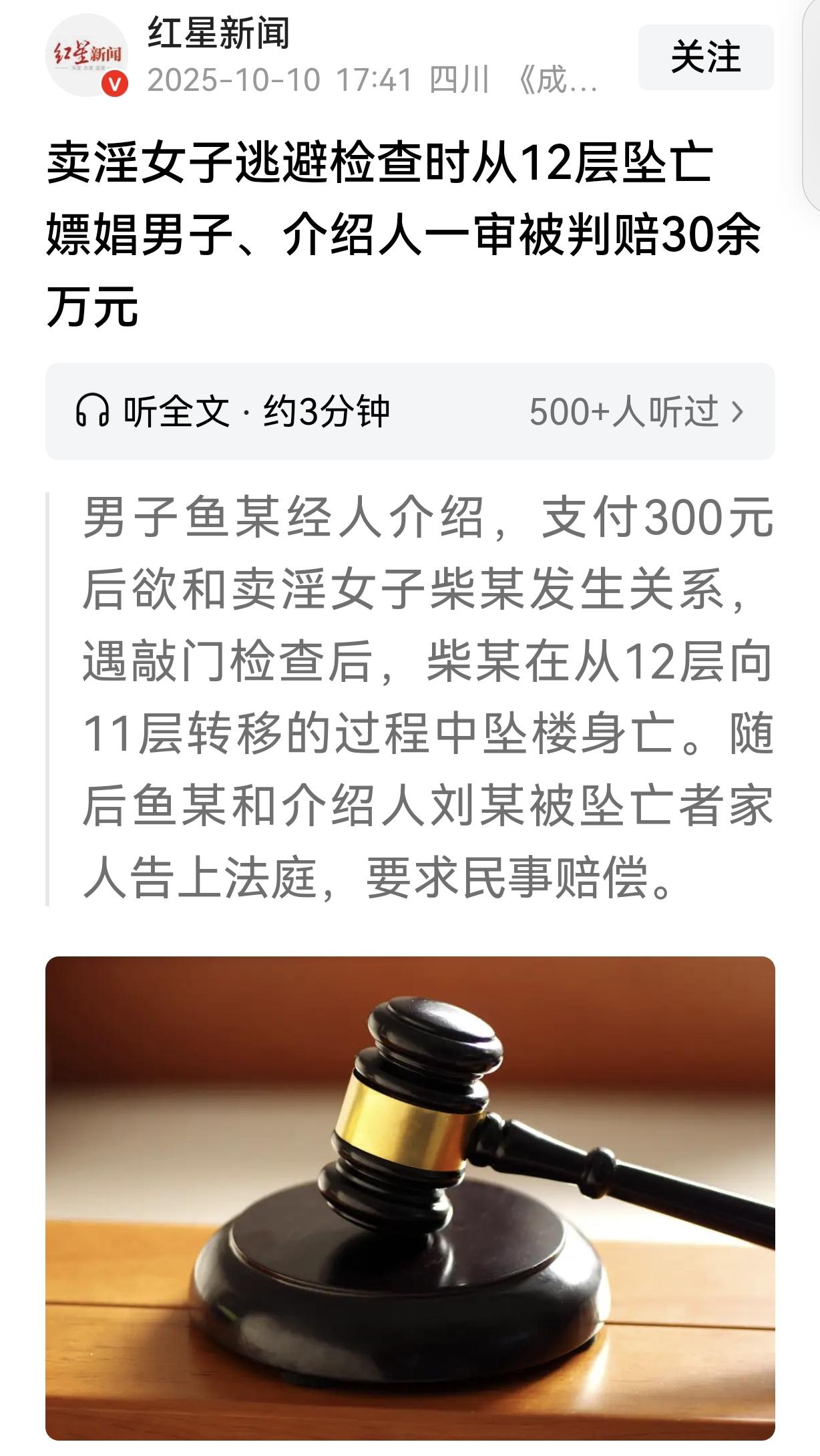 陕西西安,一女子拿了300元报酬,在为一男子有偿服务时,突然门外传来敲门声,她为了逃避检查,跟男子和介绍人求助,让他们抓住床单另一头,她想顺着床单从12楼窗户躲到11楼可万万没想到,她竟然坠楼身亡,女子家属把男子和介绍人告上法庭索赔,法院判决让2被告追悔莫及。 事情得从 2023 年 12 月 21 号晚上说起,西安灞桥区那栋高层公寓的 12 楼里,32 岁的柴某刚拿到刘某介绍来的活儿,对方抽成后她能落 300 块报酬。和付钱的鱼某待了没一会儿,门外突然传来急促的敲门声,柴某瞬间慌了 —— 她之前因为类似的事儿被处罚过,一听见动静就以为是执法人员来了。 没等鱼某和刘某反应过来,柴某已经盯上了窗户,说要抓着床单爬到 11 楼躲躲。鱼某和刘某虽然觉得悬,但架不住她催得急,俩人赶紧抓住床单另一头,看着柴某翻出窗台。公寓的床单本就薄,哪经得住成年人的重量,刚拽了没几秒就发出 “嘶啦” 的撕裂声,两人攥着布料的手猛地一松,只能眼睁睁看着柴某坠了下去。 楼下保安听见闷响跑过去,发现柴某已经没了气息,医生赶来确认是颅脑损伤当场死亡。公安调查后排除了他杀,可柴某的家属咽不下这口气,直接把鱼某和刘某告到灞桥法院,索赔近百万,说俩人帮着拽床单才导致悲剧发生。 法庭上双方吵得厉害,鱼某的律师急得拍桌子,说柴某自己是成年人,明知道爬窗危险还要干,违法在先的后果该自己担着。刘某也喊冤,说当时劝过她别冒险,是对方不听劝。但法院调取了笔录和现场勘查资料,最终认定俩人确实提供了帮助,存在过失,得承担 30% 的责任,判赔 33 万多。 这判决一出来,网友的讨论直接炸开了锅。有人在评论区怼得厉害:“自己违法跑路摔死的,凭啥让别人买单?这赔偿简直没道理!” 还有人翻出类似案例对比:“之前有家政擦玻璃自己拆护栏坠亡,法院都让自己担责,这事儿本质不也一样吗?” 但也有不同声音,有懂点法律的网友解释:“帮着拽床单就是提供了协助,哪怕是对方提的要求,参与了就得担责,这不是帮不帮腔的问题,是行为有过错。” 更有人戳破关键:“要是当时俩人坚决不配合,说不定还能拦住她,侥幸心理害了三个人。” 现在鱼某和刘某肠子都悔青了,本以为只是件见不得光的小事,没想到要赔几十万,还得背着心理包袱。柴某的家属拿到赔偿也没轻松多少,33 万换不回一条命,只剩无尽的遗憾。 对此,你们有什么看法,欢迎评论留言~