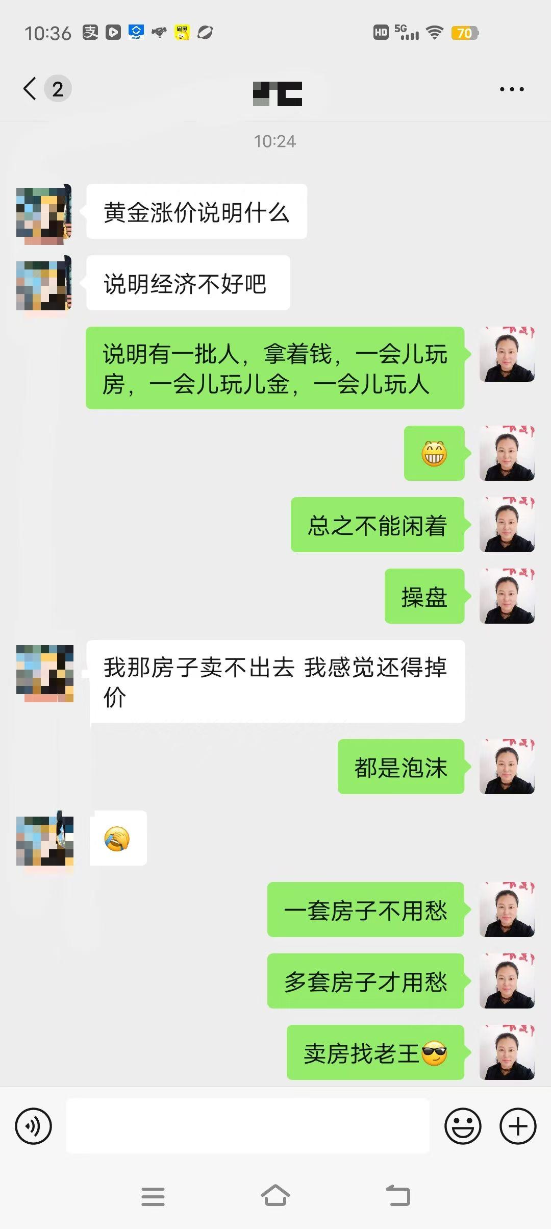 真是至理名言,黄金涨价说明了什么? 说明,有一批人,拿着钱,一会玩房,一会玩金,一会玩人。 总之不能闲着,这就是操盘。 可是再往下看…… 原来是个中介 不得不说,还是干中介的了解房产!!