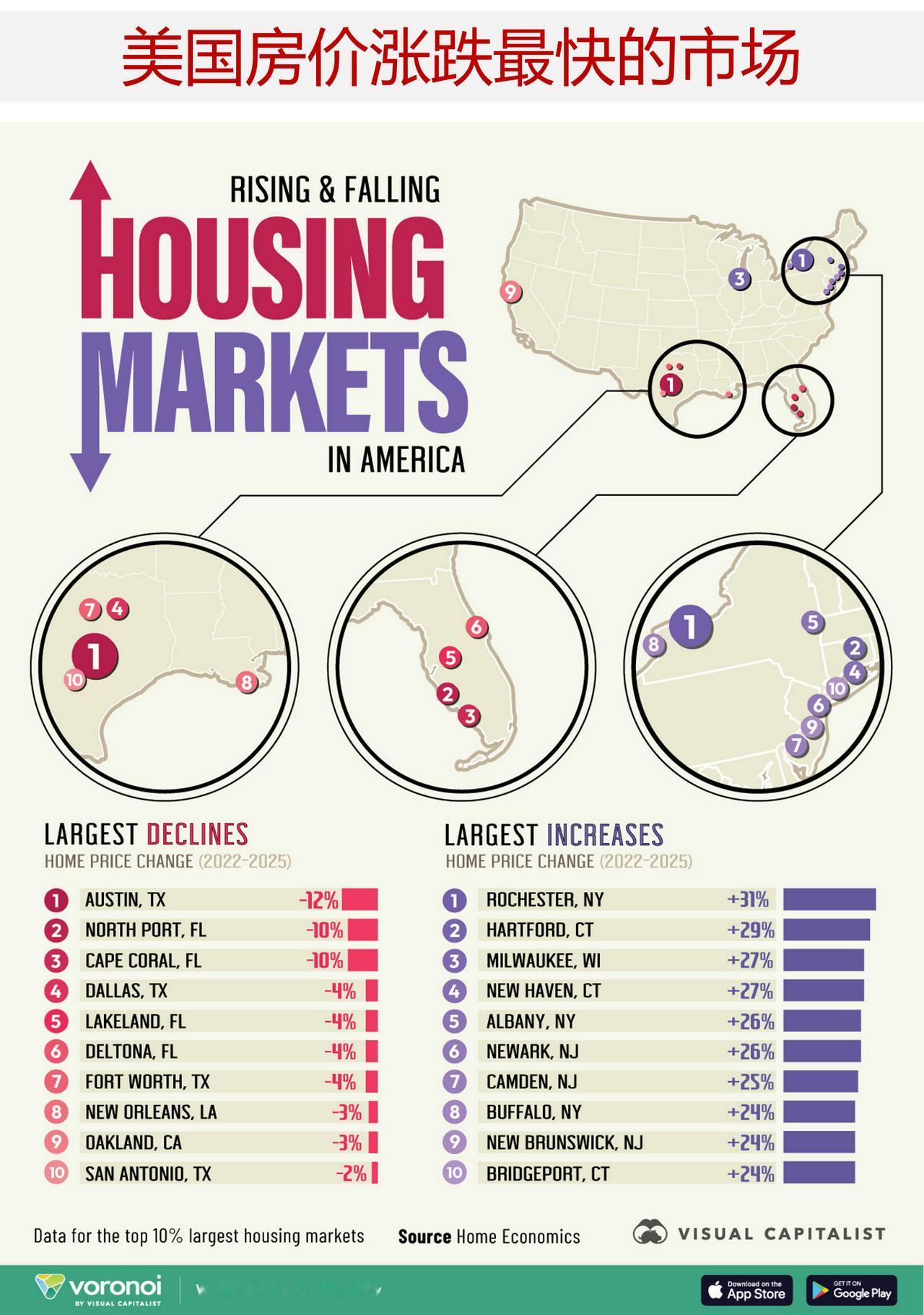 美国房价房价上涨和下跌速度最快的地区 2025 年,住房需求将逐渐向美国的东部和中西部地区转移,而南部地区的住房需求则会有所减弱。 有趣的是,这与新冠疫情期间的模式形成了鲜明的反差。在南部地区,房屋库存较新冠疫情前水平上涨了 3.6%,这得益于一波房屋建设热潮。相比之下,东北地区的库存则下降了 51%,从而推动了房价的上涨。 这张图表展示了美国各地房价上涨和下跌速度最快的地区情况,数据来源于“Home Economics”。 ——十大快速发展的房地产市场 下图展示了自 2022 年 8 月以来房价涨幅最大的美国房地产市场。 由于这些市场的价格相对较为亲民,且距离主要城市较近,东北地区的市场(尤其是纽约、康涅狄格和新泽西的市场)销售额实现了两位数的增长。 总体排名首位的是纽约州的罗契斯特市,房价上涨了 31%,这里的房屋均价仅为 286,000 美元。 紧随其后的是康涅狄格州的哈特福德市,房价上涨了 29%,因为来自其他州的买家纷纷涌入该市场。 ——南部地区的美国市场受到的冲击最为严重 相比之下,得克萨斯州和佛罗里达州的房地产市场是全美最不景气的。 在新冠疫情期间,奥斯汀的房价曾大幅上涨,但如今三年过去了,其房价却下跌了 12%。 在新冠疫情期间,得克萨斯州和佛罗里达州的房屋建设量大幅增加。但如今,许多新建房屋却处于空置状态。在佛罗里达州的开普科勒尔市,卖家正在降低房价以吸引市场低迷时期的购房者。 在西部地区,奥克兰是排名前十的城市中唯一一个房价出现下跌的地区,自 2022 年 8 月以来房价已下跌了 3%。尽管如此,该市的房价中位数仍高达 90.6 万美元——这得益于与旧金山相比,该市在居住成本方面的相对优势。