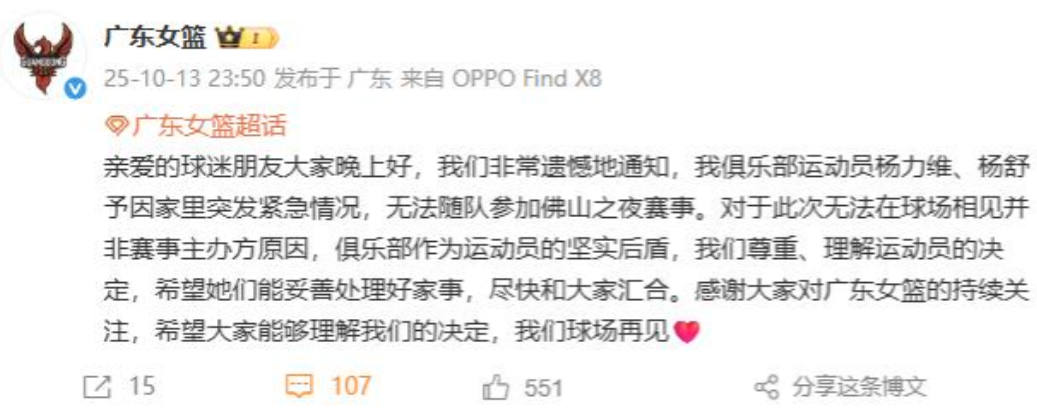 杨力维、杨舒予发文称因家里突发紧急情况,无法按原定计划参加佛山的比赛。据悉,佛山之夜赛事将于今晚(10月14日)举行。 广东女篮发文回应:我们非常遗憾地通知,我俱乐部运动员杨力维、杨舒予因家里突发紧急情况,无法随队参加佛山之夜赛事。对于此次无法在球场相见并非赛事主办方原因,俱乐部作为运动员的坚实后盾,我们尊重、理解运动员的决定,希望她们能妥善处理好家事,尽快和大家汇合。感谢大家对广东女篮的持续关注,希望大家能够理解我们的决定,我们球场再见。