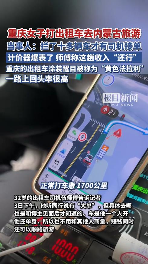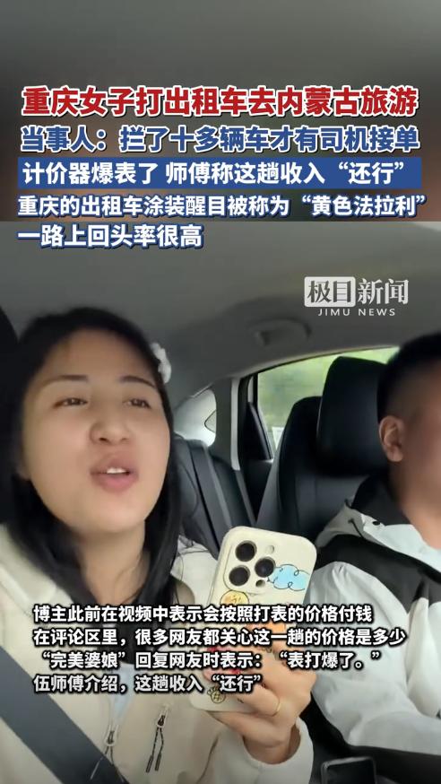 “这就是有钱任性吗?”10月13日报道,重庆一女子在路边等出租车,计划去内蒙古,而且还承担食宿费用,拦了十几辆车终于有司机接单!经过2天的奔波,这辆黄色的出租车吸引了路人的目光,最终顺利抵达鄂尔多斯。网友:这得花多少钱? 国庆假期,重庆博主“完美婆娘”的一次出行火遍全网——她打了辆出租车,目的地是1700多公里外的内蒙古鄂尔多斯,这趟旅程听起来像天方夜谭,但确实真实发生了。 那天下午,这位拥有240万粉丝的博主站在沙坪坝街头拦车,她逢车就问:“师傅,去内蒙古吗?”听到目的地,十几位司机连连摆手,毕竟1700公里的距离,相当于重庆到北京的路程,换谁都得掂量掂量。 转机出现在一位热心司机身上,他虽然没接单,但把这个“大单”转告给了同行伍师傅。伍师傅琢磨了一下:既能挣钱又能当旅游,何乐不为?双方很快谈妥条件——按计价器正常收费,路上吃住和充电费全由博主负责。 他们开的是重庆街头常见的黄色电动出租车,被当地人戏称为“黄色法拉利”,这辆车平时在市区跑,最远也就到周边区县,如今却要完成一次跨越大半个中国的征程。 路上最有意思的是充电环节,每次在服务区充电,这辆挂着渝A牌照的黄色出租车总会引来围观,有人好奇地问:“师傅,这是从重庆开过来的?”当得知他们要去内蒙古时,大家都惊讶得合不拢嘴,有位大叔竖起大拇指:“现在的年轻人真敢想!” 经过两天一夜的奔波,10月5日,他们顺利抵达鄂尔多斯,博主终于如愿站上了草原,骑着马在辽阔的天地间奔跑,视频里,她笑得特别开心,看得出这趟旅程没有白来。 大家最关心的还是车费,博主透露,计价器在半路就显示不下了,最终打表费用接近5000元,加上两天的食宿和沿途充电,总花费应该在七八千元左右,这个价格比高铁机票贵不少,但对博主来说,买的就是这份独特体验。 视频发布后,涨粉7万多,不少网友留言说想尝试,不过也有人质疑这是不是提前设计好的“剧本”,博主和伍师傅都回应,两人此前完全不认识,纯属偶然,出租车公司也表态,这是司机私人行为,公司并不鼓励这种存在安全隐患的长途运营。 从商业角度看,这确实是一次成功的内容创作,240万粉丝的博主,用一次不走寻常路的旅行,收获了流量和话题度,而伍师傅也获得了一笔可观收入,还免费游了一趟内蒙古。 “这波操作我是服的,但说实话,出租车跑长途风险不小,尤其是电动车,路上充电、车况都是问题,公司都说了不支持,万一出点事谁负责?感觉还是有点冲动啊。” “哈哈,但人家确实到了,还在鄂尔多斯骑马了!这种体验坐飞机高铁可真没有,不过计价器都跑爆表了,我猜最后车费得小一万吧?博主一直没公布,估计数字挺吓人。” “这不明显是剧本吗?司机座椅上提前放了冲锋衣,一看就是有准备的,现在网红为了流量啥不敢演?上次打车去西藏,这次来内蒙古,下次是不是要打车去海南了? ” “我也觉得是炒作!听说她靠这条视频涨了七八万粉丝,一条广告报价六七万,这波根本不亏,反而血赚。普通人哪会这么花钱?都是生意。” “虽然有点疯狂,但我挺羡慕这种说走就走的劲儿,现代人旅行太追求效率了,反而忘了“在路上”的感觉,这种慢慢走、随性停的旅程,本身就是一种体验。” “羡慕归羡慕,但普通人学不来,这哪是有钱任性?这是有钱烧得慌!有这钱够我全家玩两三趟内蒙古了。 ” “作为重庆人,看到“黄色法拉利”跑到内蒙古还挺自豪的!这车成了移动的城市名片了,一路给重庆打广告,挺好。” 这种”打车跨省”是真正的勇敢体验,还是精心策划的流量生意?如果你是司机,你会接这一单吗?欢迎在评论区聊聊你的看法! 信源:极目新闻