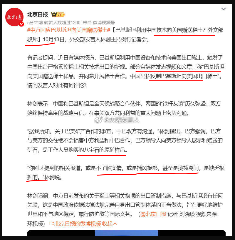 热点评论 ,中方回应巴基斯坦向美国赠送稀土 ,巴基斯坦向美国出口稀土