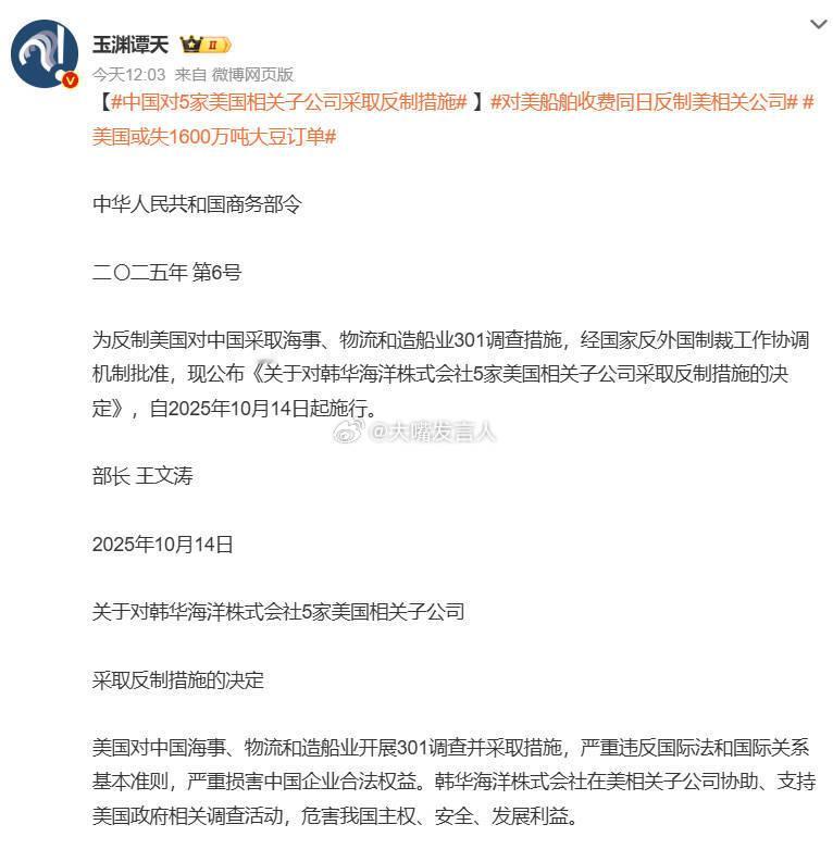 对美船舶收费同日反制美相关公司, 美国或失1600万吨大豆订单,热点评论