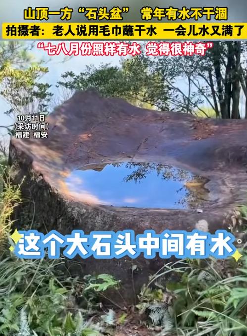 这个石头盆太奇妙了!福建,一男子户外登山时,发现山顶有个“石头盆”,之间装满了水,太阳直晒也不干涸,当地老人说“用毛巾把水弄干,它一会儿就又满了,"这到底是什么情况? 这个奇特的石头盆就在福安某座山的山顶上,整块石头大概有2米左右,最神奇的地方在于,无论天气多么炎热,太阳怎么暴晒,里面的水就是不会干,更让人惊讶的是,即便在降雨稀少的七八月份,这个天然形成的石盆里依然水量充沛。 最近,一位登山爱好者专门去实地查看,当时福安已经连续十几天没有降雨,按理说山顶的积水早就该蒸发殆尽了,可眼前的景象却让人大跌眼镜,石盆里的水不仅没有减少,反而满满当当清澈见底。 当地村民对这个石头盆早就见怪不怪了,有位老人说,这石头在山顶存在很多年了,祖祖辈辈都知道这里有个永远不会干的水盆,最神奇的是,如果您用毛巾或者其他工具把水弄干,不出一会儿功夫,水又会慢慢渗出来,直到恢复原来的水位。 这种现象引起了不少人的好奇,有人猜测是雨水积存,但这解释不了为什么长时间不下雨水还不干,有人认为是露水凝结,可露水的量根本达不到填满整个石盆的程度,还有些迷信的说法,认为这是什么灵眼之泉,是山神的恩赐。 其实从科学角度来看,这个现象并不神秘,福安地处中亚热带季风气候区,年降水量充沛空气湿度大,山顶的这块石头很可能是由砂岩、页岩或者多孔花岗岩构成的,这类岩石内部布满了细小的孔隙和裂缝,就像一块巨大的海绵,能够储存大量水分。 更关键的是,这个石头盆极有可能连接着地下水系统,山体内部的地下水通过岩石裂缝不断向上渗透,在这个天然形成的凹槽处汇聚,即使表面的水被蒸发或者人为清除,地下水源会持续补充,保持水位稳定,这就解释了为什么擦干了又会满的奇特现象。 除了地下水补给,山顶特殊的地理位置也起到了重要作用,高海拔地区温差大夜间温度低,空气中的水汽容易在岩石表面凝结,福安山区经常云雾缭绕,雾滴不断附着在岩石上,顺着石头表面流入盆中,成为另一个重要的水源补充途径。 这种天然形成的石头盆在地质学上被称为壶穴或岩臼,是流水长期冲刷侵蚀形成的,不过福安这个石头盆的特殊之处在于,它不仅保存了原始的地质形态,还因为独特的地理位置和水文条件,形成了一个永不干涸的天然蓄水池。 类似的地质奇观在其他地方也有发现,比如广西的某些喀斯特地貌区,也存在类似的天坑积水现象,但像福安这样,在山顶形成稳定水源的案例确实比较罕见。 对于当地人来说,这个石头盆不仅是一处自然奇观,更是一个实用的水源地,过去交通不便的年代,上山采药、打猎的人经常在这里补充饮水,有老人回忆即使在最干旱的年份,这里的水也从未断过,救过不少人的急。 这个看似神秘的自然现象,实际上完美展现了大自然的水循环系统,地下水、雨水、雾水、露水,多种水源通过不同途径汇聚到这个天然容器中,又通过蒸发回到大气,形成了一个微型的水循环系统。 大自然的鬼斧神工总是让人惊叹不已,一块看似普通的石头,因为特殊的地质构造和地理位置,成就了这样一个神奇的现象,它提醒着人们,在科技高度发达的今天,依然要对自然保持敬畏之心,因为还有太多的奥秘等待着我们去探索和发现。 麻烦看官老爷们右上角点击一下“关注”,既方便您进行讨论和分享,又能给您带来不一样的参与感,感谢您的支持!