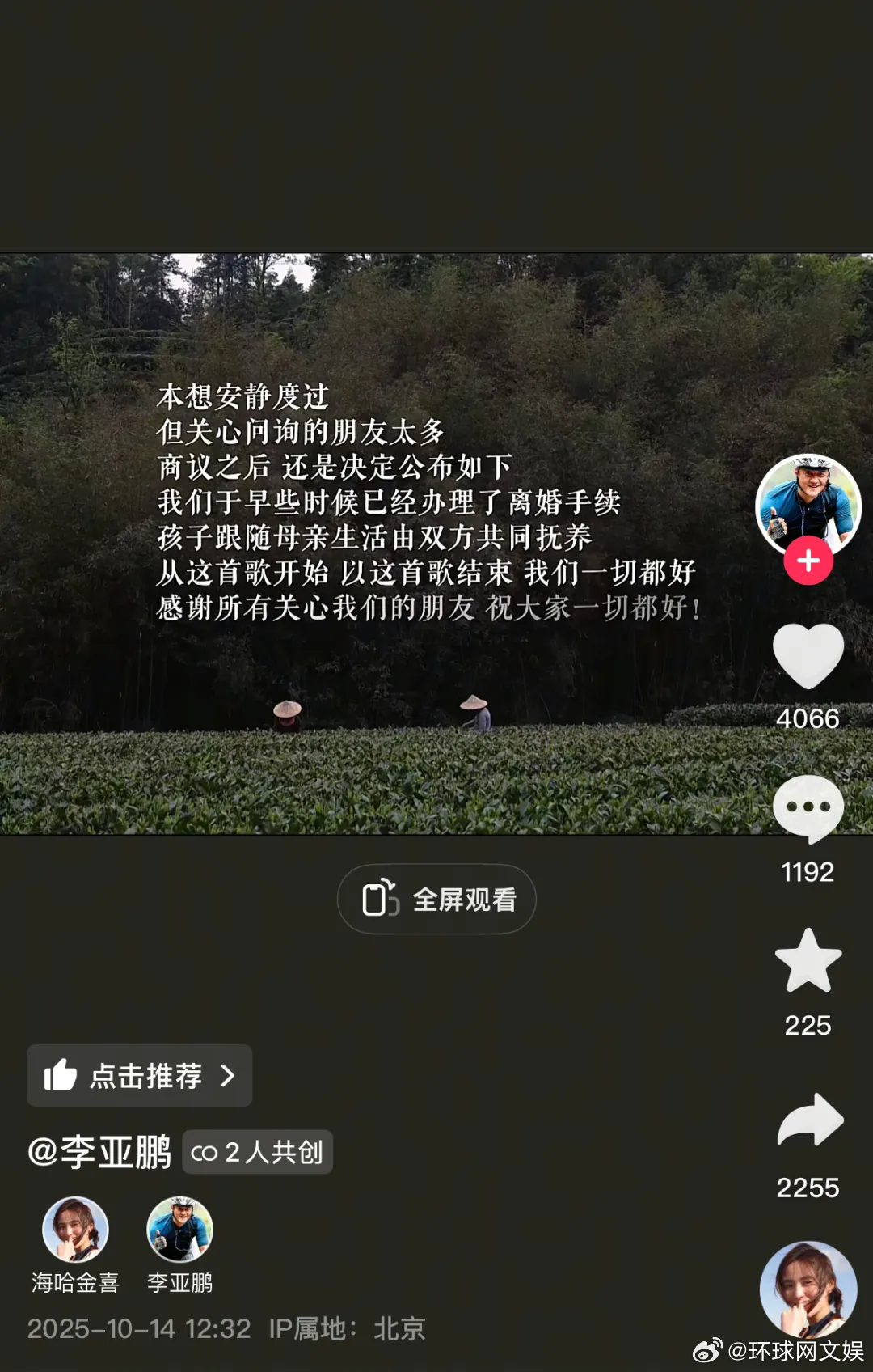 【#李亚鹏离婚# 】10月14日,李亚鹏和妻子海哈金喜共同发布视频,称两人已于早些时候办理了离婚手续,孩子跟随母亲生活,由双方抚养。