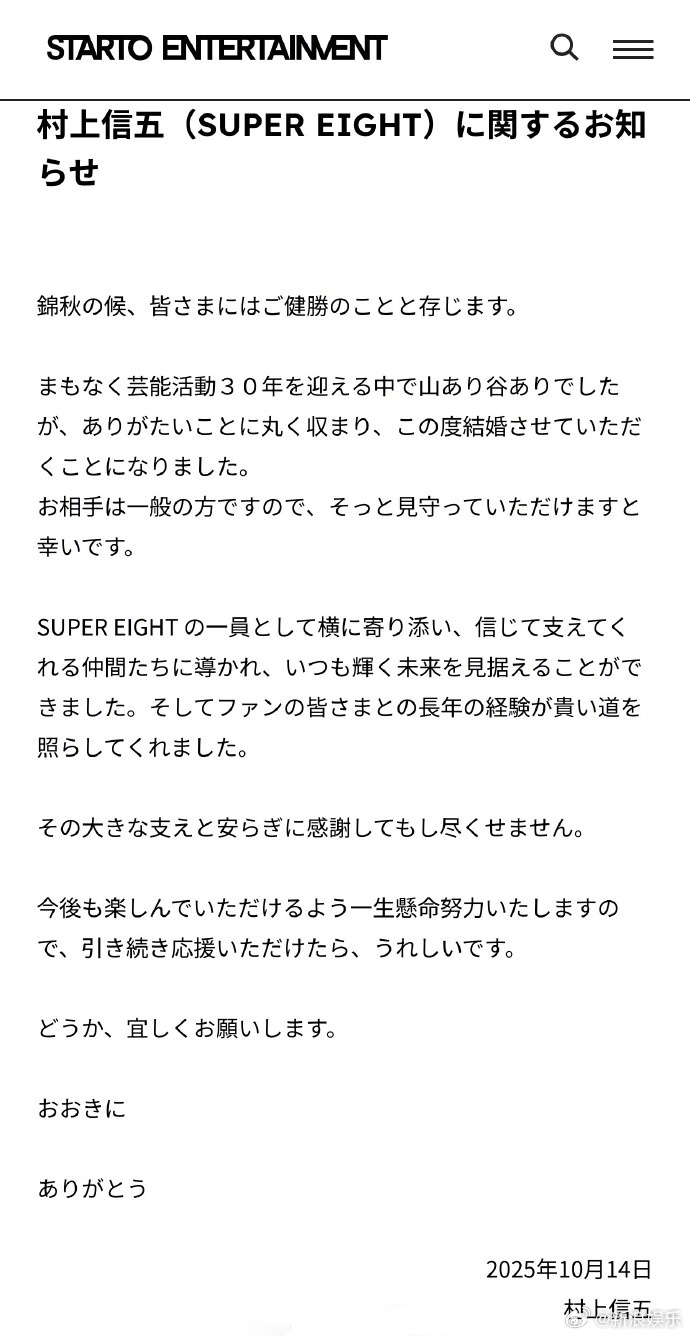 村上信五结婚村上信五官宣结婚据日媒,14日,SUPEREIGHT村上信五官宣