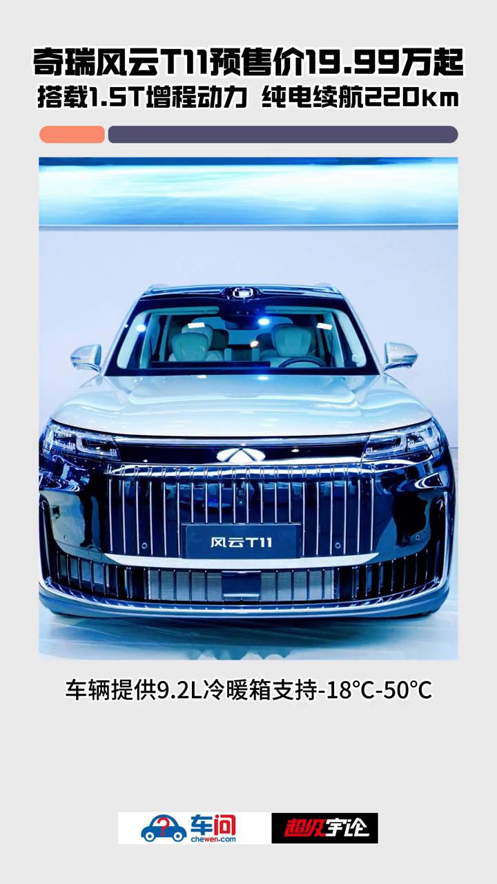 奇瑞风云T11预售价19.99万起,搭载1.5T增程动力,纯电续航220km。