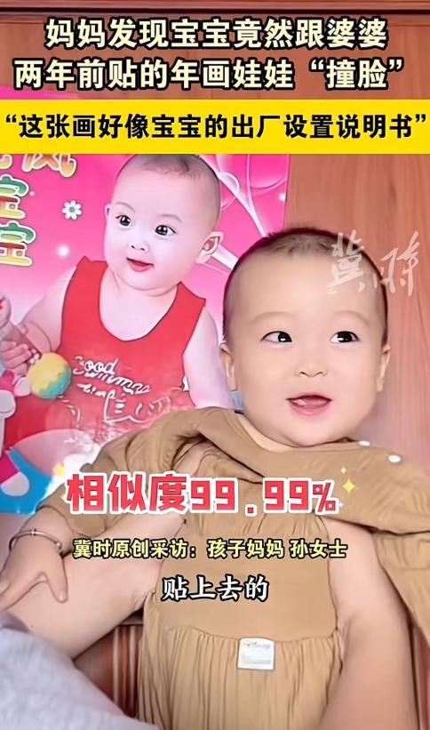 这年画也太神奇了吧!10月8日,山东济南,一位妈妈带宝宝回老家,发现宝宝居然跟婆婆两年前贴的年画娃娃“撞脸”!妈妈:“不能说一模一样,简直是一个模子刻出来的!相似度99%!”网友:真像,有点不科学了! 一位年轻妈妈带着不到一岁的宝宝回婆家过国庆,结果发现自家孩子跟墙上贴的年画娃娃长得几乎一模一样。 这个年画是婆婆两年前贴在墙上的,当时女子和丈夫刚结婚,女子的婆婆特别盼着抱孙子,就在新房墙上贴了张年画娃娃,老人家说这是讨个吉利,希望儿媳妇能早点生个白白胖胖的宝宝,当时新媳妇也没太当回事,觉得就是老人的一片心意。 没想到,婚后没多久这位妈妈还真就怀孕了,十个月后顺利生下一个男宝宝,因为工作原因,小两口带着孩子在外地生活,平时很少回老家,婆婆虽然想孙子想得紧,但也只能通过视频看看。 今年国庆长假,夫妻俩商量着该带孩子回去看看老人了,毕竟孩子都快一岁了,婆婆还没怎么抱过呢。 回到老家那天婆婆高兴坏了,抱着孙子左看右看,嘴里不停念叨着长得真俊,年轻妈妈放下行李环顾四周,老房子还是原来的样子,墙上的装饰也没变。 就在这时女子的目光落在了墙上那张有些泛黄的年画上,画上的娃娃圆脸蛋、大眼睛,笑得特别甜,她盯着看了几秒,心里突然咯噔一下,这娃娃怎么看着这么眼熟? 女子赶紧把怀里的宝宝抱到年画跟前仔细对比,这一看不要紧,简直惊掉了下巴,两个娃娃的眉眼、鼻子、嘴巴,甚至连脸型都惊人地相似,特别是那对弯弯的眉毛,弧度都一样,就像用同一个模具印出来的。 妈,您看看,这也太像了吧,女子忍不住叫来婆婆。 婆婆凑过来一瞧,也愣住了:哎呀,还真是,当初贴这画就是图个吉利,没想到咱家宝宝真就照着这个样子长了。 一家人围着年画和宝宝议论纷纷,都觉得这事儿太玄乎了,有人说这是心诚则灵,有人说这是巧合,还有人开玩笑说这年画有魔力。 这位妈妈把对比照片发到网上后,立马引起了热烈讨论,有网友分享说自己也遇到过类似的事:我家也是,婆婆贴的双胞胎年画,结果我真生了双胞胎,长得还挺像画上的。 还有人从科学角度分析:可能是心理暗示作用,孕妇经常看到某个形象,潜意识里会有影响。 不过更多人觉得这事儿用科学解释不通:孩子的长相不是由父母基因决定的吗,怎么会像年画呢。 其实类似的巧合在民间并不少见,有些地方还有专门的习俗,新婚夫妇会在房间里贴上漂亮宝宝的照片,希望将来生的孩子也能这么好看,虽然听起来有点迷信,但这种美好的期盼本身就是一种祝福。 这种现象可能跟选择性注意有关,当人们心里有了某种期待,就会不自觉地寻找相似之处,比如这位妈妈,可能会更关注宝宝和年画相似的地方,而忽略了不同之处。 但不管怎么解释,这件事确实给这家人带来了惊喜和快乐,婆婆逢人就说这是心想事成,年轻妈妈则把这当成了一个有趣的家庭故事。 生活中总有些事情超出常理,与其纠结于科学解释,不如享受这份奇妙的缘分,毕竟这种巧合给平凡的生活增添了一抹神奇的色彩,也让这个国庆假期变得格外难忘。 麻烦看官老爷们右上角点击一下“关注”,既方便您进行讨论和分享,又能给您带来不一样的参与感,感谢您的支持!