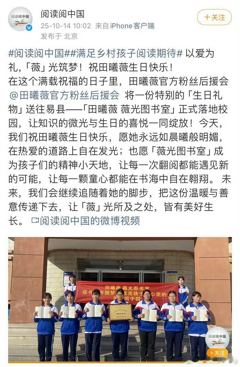 田曦薇生日,粉丝策划的特别礼物“田曦薇 薇光图书室” 满足乡村孩子阅读期待…