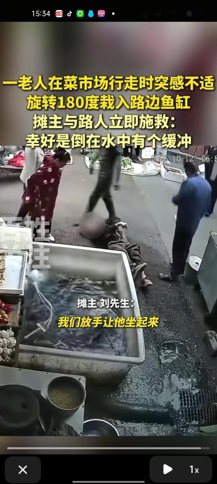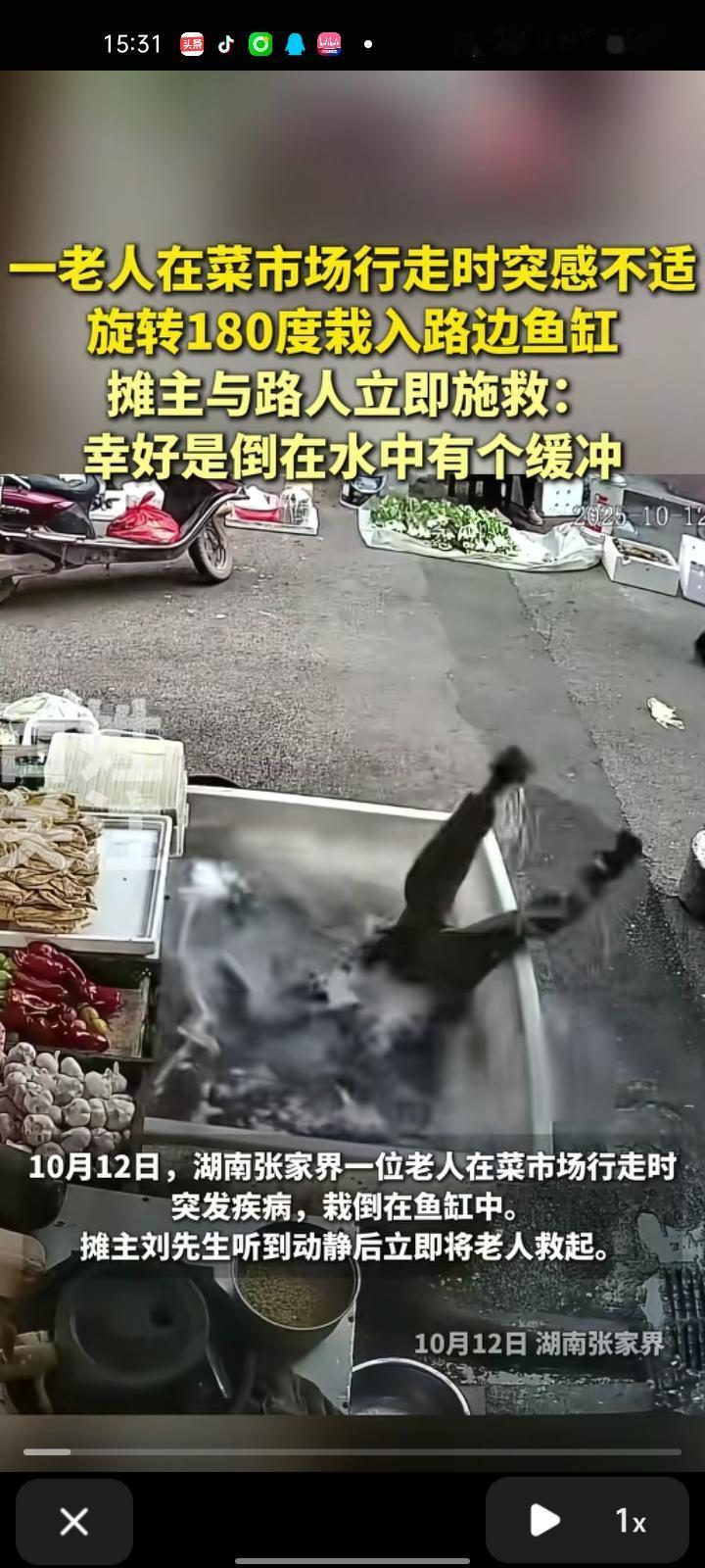 10月12日,张家界市桑植县。一位老人在菜市场行走时突发疾病,栽倒在鱼缸中,摊主听到动静后立即将老人救起,幸亏是往鱼缸到,如果倒在路上估计没命了。摊主称,过了两分钟老人就清醒了,疑因没吃早餐导致晕倒,周边群众纷纷帮忙,所幸无大碍。