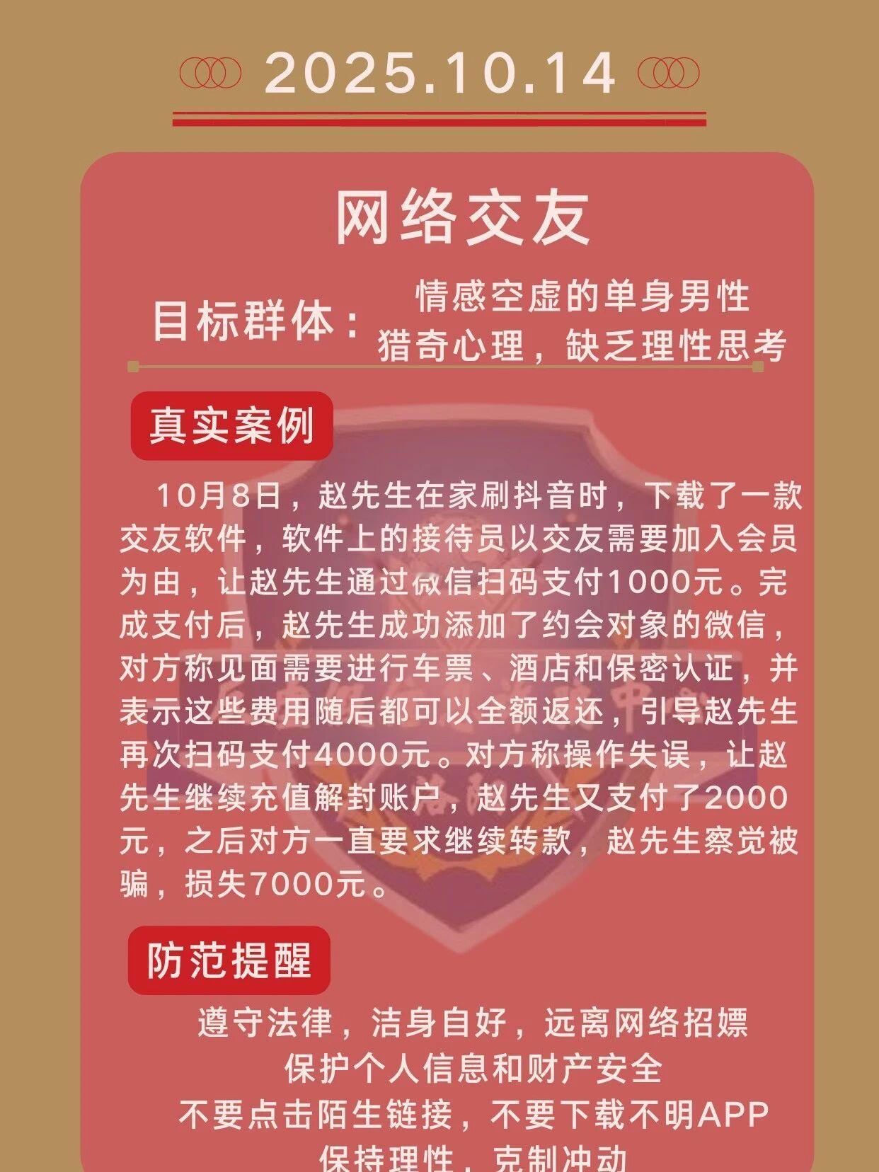 今日反诈提示(2025.10.14) 遵守法律,洁身自好,远离网络招嫖