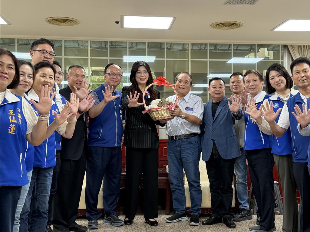 国民党党主席候选人郑丽文14日拜会桃园市议长邱奕胜,24位蓝营议员一字排开高喊「