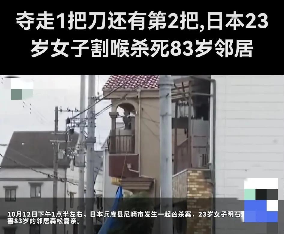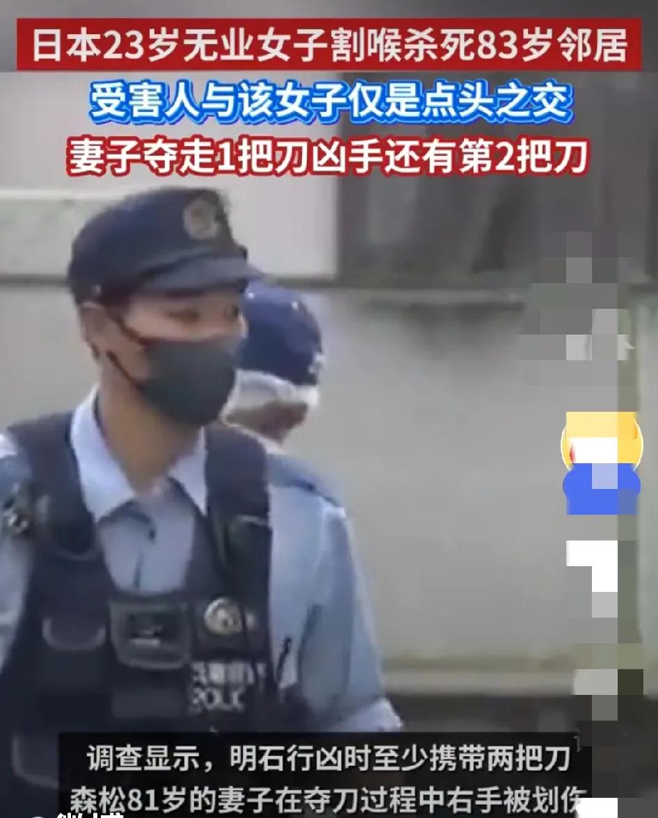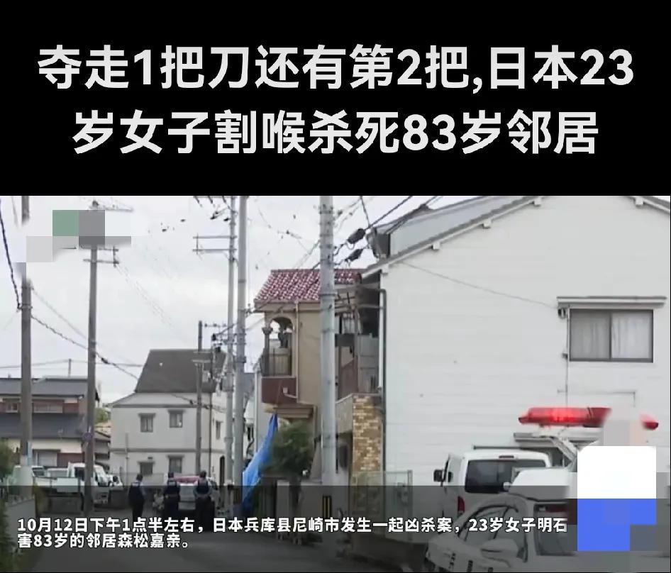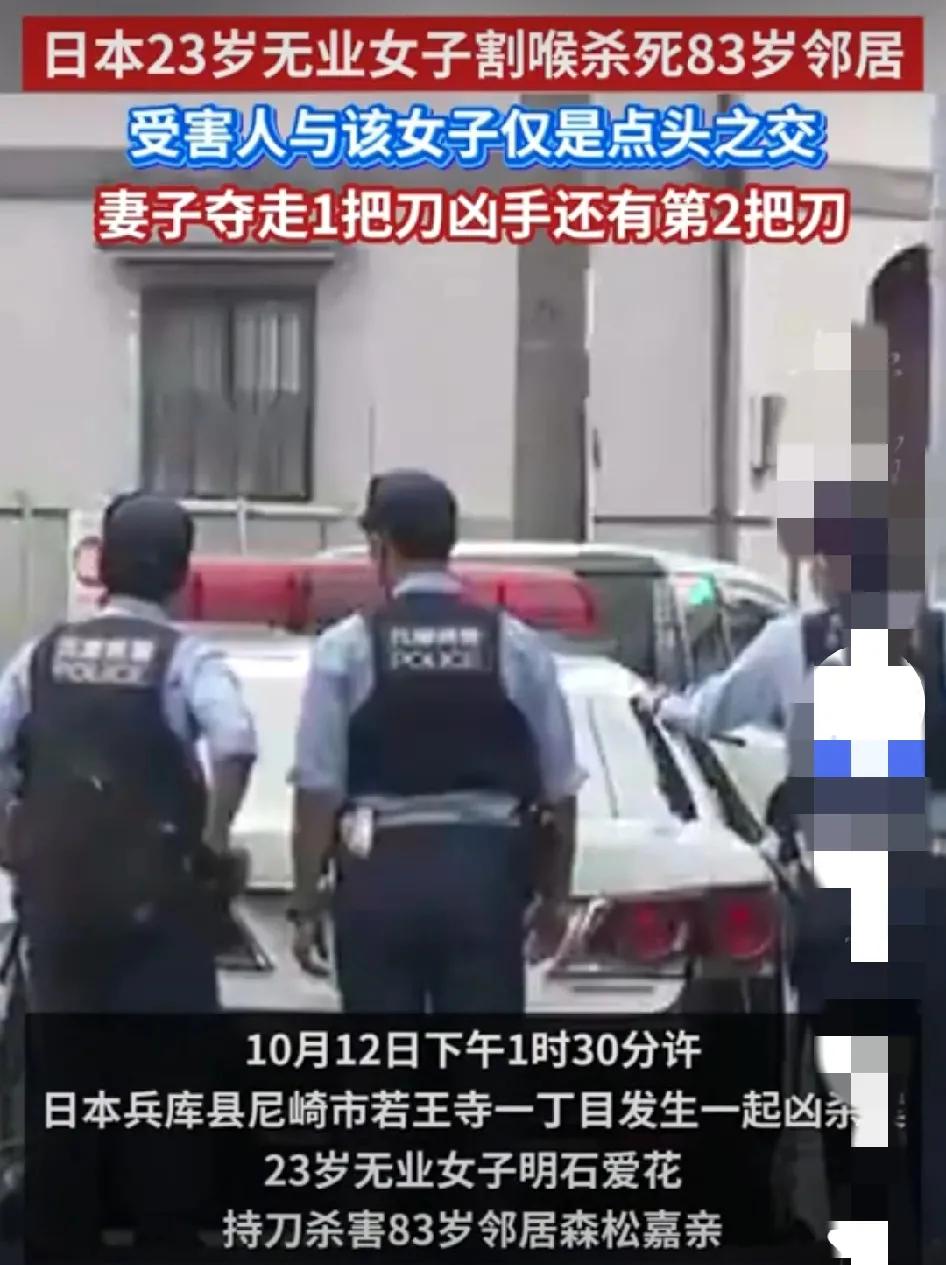 日本年轻女子双刀杀邻居 太凶残了!日本治安太差了!女子在警察面前杀人,日本警察愣没制止,不作为,这是什么风气?还有,23岁女子和80老太没有仇恨,只是点头之交,为什么年轻女子必须杀她呢?奇葩的社会,奇葩的国度,奇葩的女子! 据报道,日本兵库县尼崎市发生的一起恶性命案,23岁女子明石爱花持两把菜刀当着警察面杀害83岁邻居森松嘉亲,受害者送医途中死亡。明石爱花在警察抵达后仍持续攻击受害者颈部,双手持刀行凶,导致森松嘉亲因颈动脉破裂死亡。其81岁妻子在夺刀时左手受伤。 再有,警方称嫌犯至少使用两把菜刀,第一把被夺后换第二把继续行凶。双方平日仅是点头之交,无纠纷记录。明石爱花供述“必须打倒对方”,但具体原因仍在调查中。 另外,警方对凶手持续攻击的应对速度引发讨论,部分舆论质疑基层警力应对突发暴力的效率。 总之,这类案件暴露出日本社会对无业青年心理健康及就业支持的缺失,年轻凶手与独居老人之间的年龄差加剧公众对老龄化社会安全隐患的焦虑。