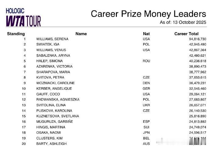 wta[超话]网球talking大会斯瓦泰克WTA奖金历史第二人