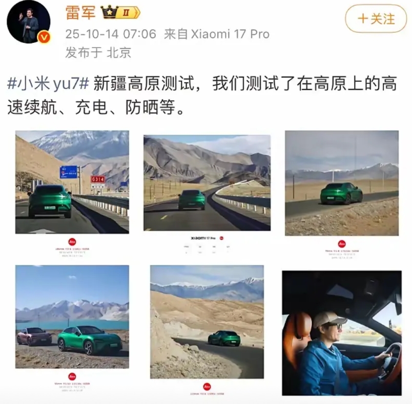 北京时间2025年10.14日早晨07:06分,雷军终于更新了微博动态,简单明了就是在新疆进行高原测试。