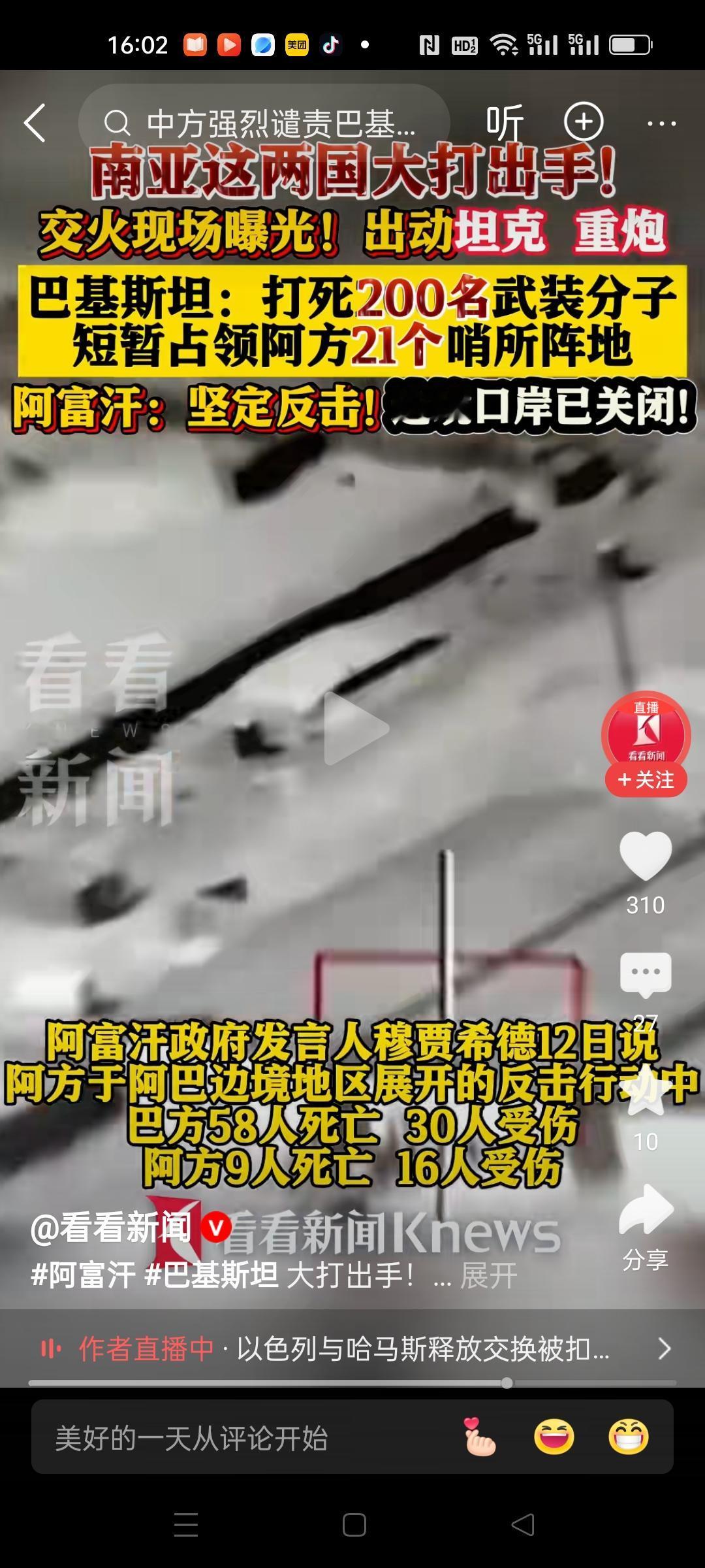 巴基斯坦和阿富汗越打越激烈! 巴基斯坦使用重炮,坦克暂时占领阿富汗边境21个哨所。双方都有伤亡。 巴铁自从用中国歼10打败了印度空军以后,就有点飘了。这次是率先用飞机越界空袭阿富汗,说是打击恐怖分子,挑起的战斗。 什么事情不能好好谈,非要打仗。况且阿富汗不是印度,把苏联,美国都赶走了 绝对不好惹。 巴铁兄弟啊,劝你冷静一下,还是和平解决的好,另外还有件事想问问,你是不是把稀土卖给美国啦?