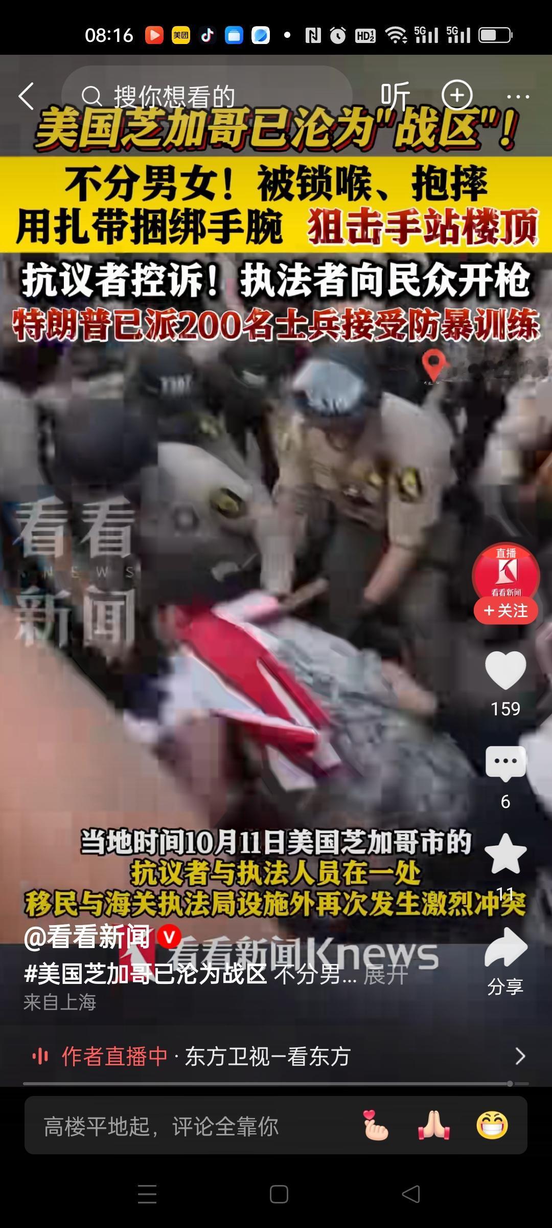 芝加哥持续混乱!特朗普又派200名警卫队过去镇压抗议者,这是想把事情越搞越大啊! 现场看到抗议者和执法者混战,抱摔,扼喉,用扎带捆绑,反正就是激烈冲突。 美国移民与海关执法局也是厉害,半夜突击到别人家抓人,还有消息称对抗议者开枪,楼顶都部署狙击手。 我很奇怪,美国不是大部分家里都有枪吗,抗议者为什么不拿枪跟他们干,打赢了,把芝加哥搞独立多好啊!