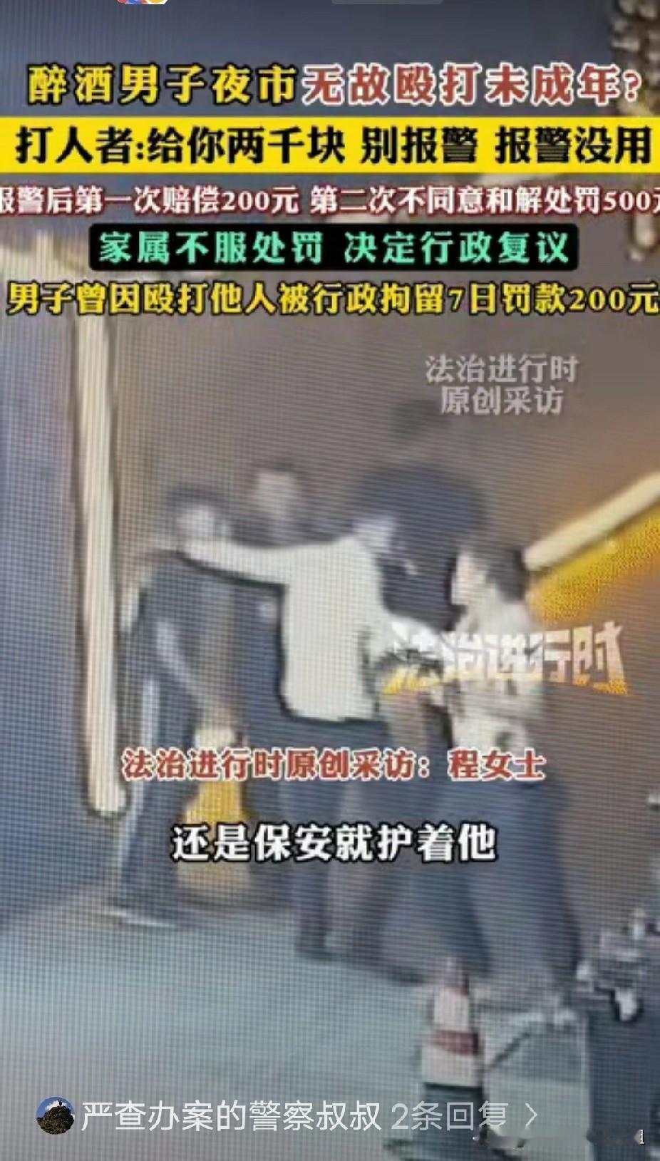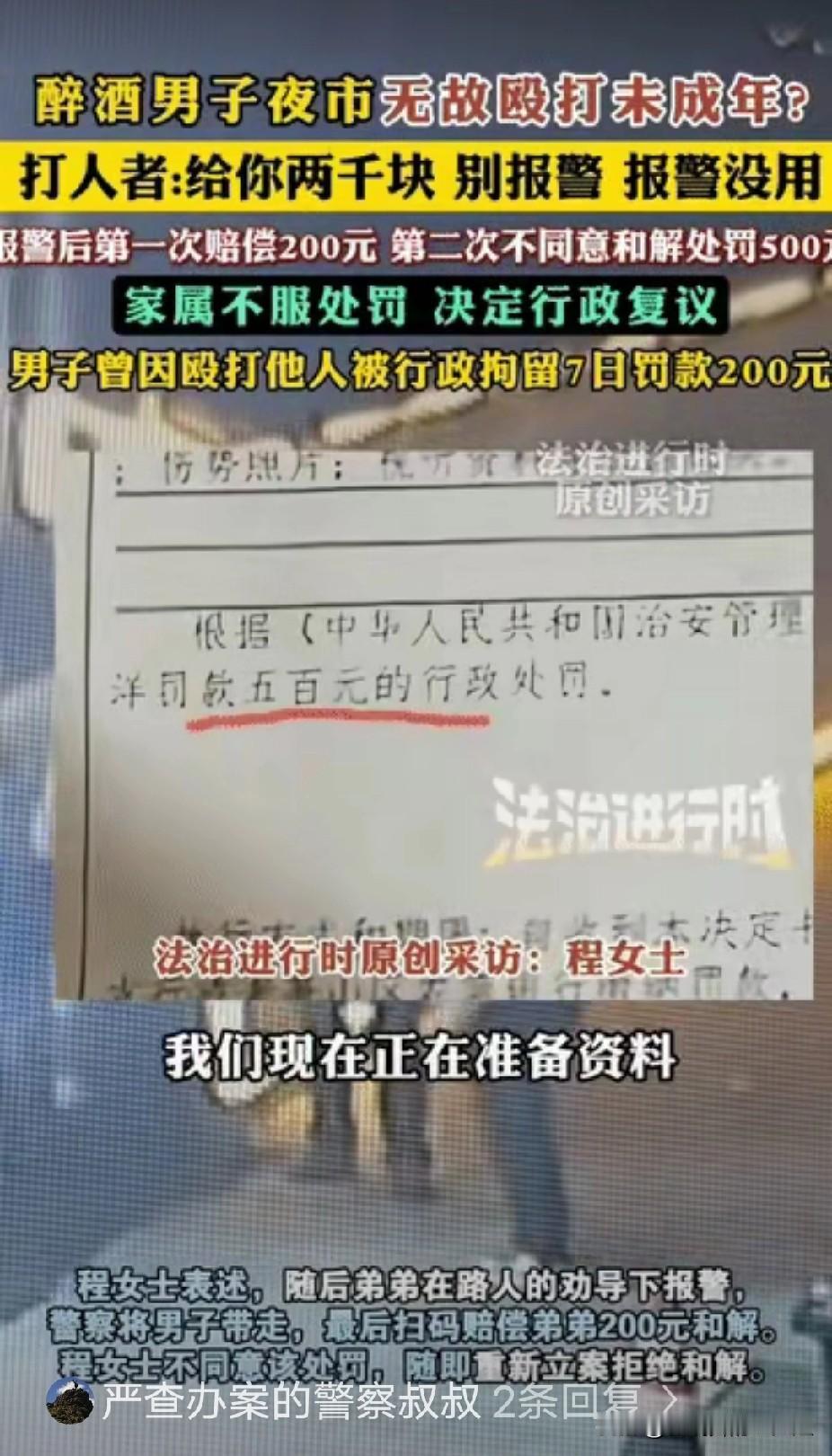 “你报警没用!”山东,一夜市发生令人愤慨的一幕,一名醉酒男子无故殴打未成年人后,不仅试图用钱“私了”,更公然叫嚣报警无用。更令人愤慨的是,报警后的结果更是让受害者家属无法接受,感到心寒,他们已决定通过行政复议途径寻求公正! 事情发生在山东某个夜市,一个浑身酒气的男子对着一个孩子拳打脚踢,甚至狠狠踹向孩子身体。孩子被这突如其来的暴力吓坏了,周围的人也惊呆了。等家属冲上前制止,打人男子非但没有丝毫歉意,反而摆出一副“有钱就能摆平”的架势,对着家属嚷嚷:“给你两千块,别报警!报警没用,我有的是办法!” 这种嚣张气焰,任哪个家长听了都得火冒三丈。 家属当然选择了报警。可让他们心寒的事情才刚开始。第一次调解,打人者仅仅赔了200元就想草草了事。家属拒绝后,警方的第二次处理结果也只是对打人者罚款500元,没有拘留。更让人无法接受的是,一查才知道,这名打人男子根本不是第一次犯事,他之前就因“殴打他人”被行政拘留过7天。一个有前科的人,再次殴打未成年人,处罚结果却比初犯还“温柔”,这实在让人想不通。 这里就不得不提法律的具体规定了。《治安管理处罚法》写得明明白白,殴打他人,一般处5到10日拘留,并处200到500元罚款。但如果殴打的是像本案中这样的未成年人,法律规定这属于“情节较重”的情形,应该从重处罚,至少是拘留5天以上并罚款。法律之所以这么规定,就是因为未成年人是需要社会特殊保护的弱势群体。醉酒从来不是违法的借口,法律明确规定醉酒的人违反治安管理一样要受处罚。那么,面对这种既有前科、又针对未成年人施暴的行为,最终仅以罚款了事,确实很难让人信服这体现了“从重处罚”的法律精神。这也不怪家属坚决要申请行政复议了。行政复议就是老百姓对行政部门的处罚决定不服时,去找它的上级部门“评评理”的法律途径。如果上级部门认为原处罚确实“量罚不当”,就会要求重新处理,到时候打人者很可能被追加拘留处罚。 这件事真正戳中大家痛点的,是它可能传递了一个极其危险的信号:殴打未成年人的代价是不是太低了?今天罚五百,明天是不是就敢更嚣张?这不仅仅是一个孩子挨打的问题,它关系到所有家长的安全感,关系到法律能不能真正成为弱者的盾牌,而不是让施暴者觉得“报警没用”。对于这种危害社会基本秩序、挑战法律底线的行为,必须让他付出应有的代价,才能震慑潜在的施暴者。 各位读者你们怎么看?欢迎在评论区讨论。