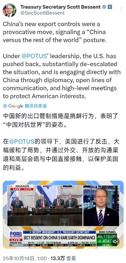 美国财政部长贝森特今天(北京时间10月14日)发文写道:“中国新的出口管制措施是