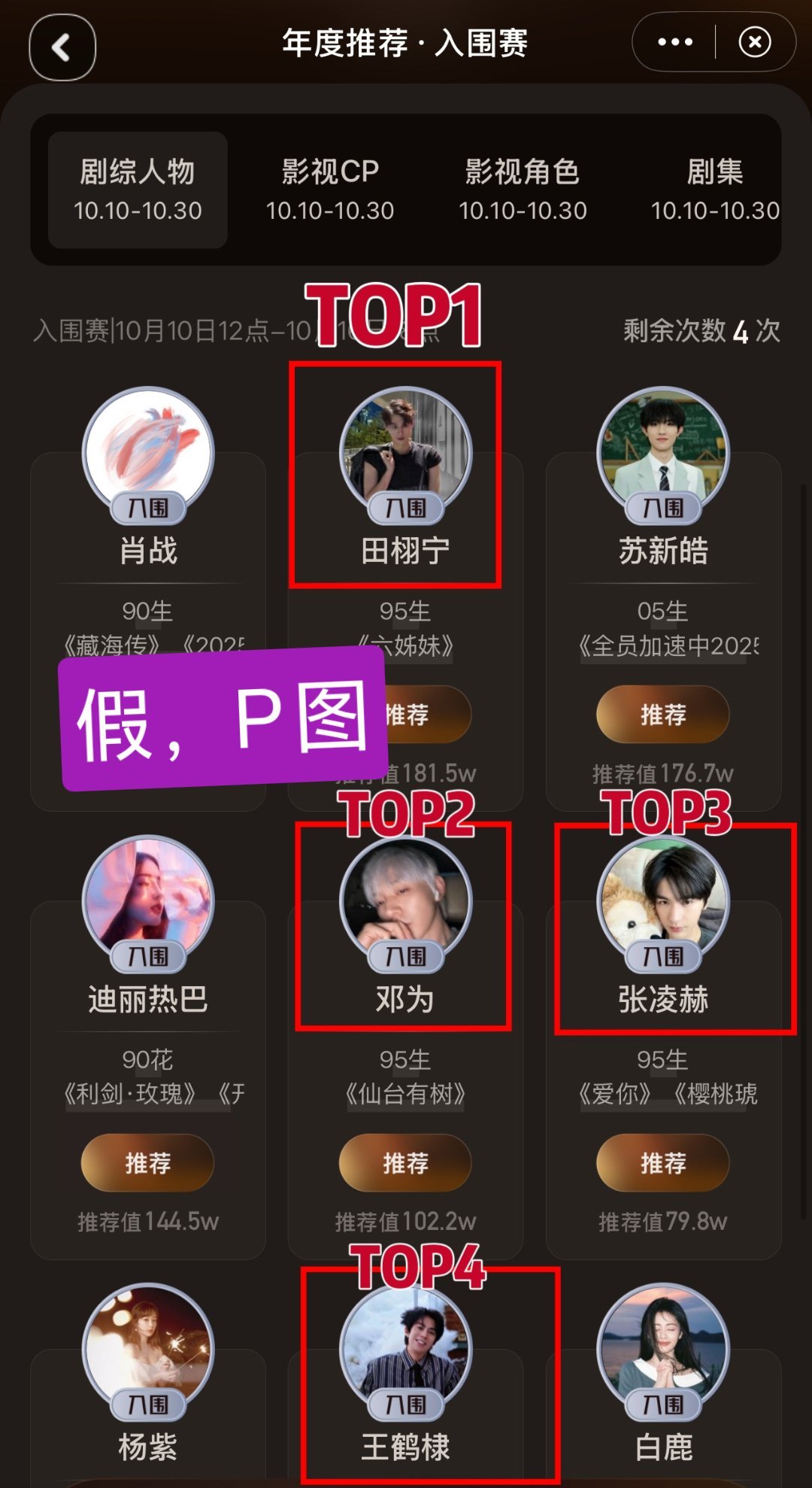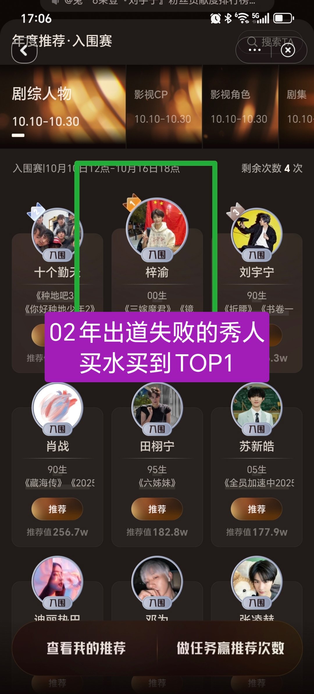 只要投这个视界大会的都知道梓渝粉丝买水搞得人家其他几家都懒得投了故意发田栩宁第一