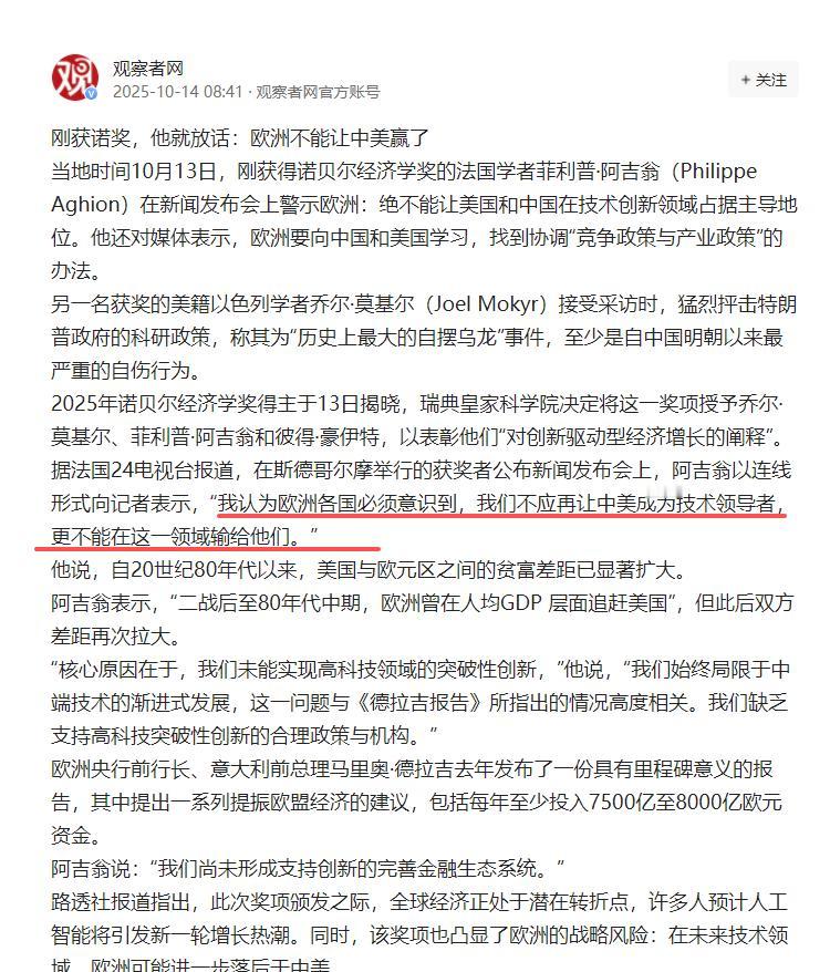 刚获诺奖,他就放话:欧洲不能让中美赢了。 当地时间10月13日,刚获得诺贝尔经济学奖的法国学者菲利普·阿吉翁(PhilippeAghion)在新闻发布会上警示欧洲:绝不能让美国和中国在技术创新领域占据主导地位。 他还对媒体表示,欧洲要向中国和美国学习,找到协调“竞争政策与产业政策”的办法。 这话可不是空穴来风,毕竟他这辈子研究的就是“创造性破坏”那套增长逻辑,看明白创新才是经济的命门,自然比谁都清楚欧洲现在的处境有多被动。 作为“熊彼特增长模型”的开创者之一,他太懂新技术颠覆旧格局的力量,也正因如此,才会在新闻发布会上直言不讳,警告欧洲不能让中美在技术创新领域把风头全抢了去。 欧洲的问题说穿了就是陷入了阿吉翁口中的“中等技术陷阱”,手里攥着世界一流的基础研究成果,却愣是没能把它们变成能打硬仗的创新产品。 有数据摆在那,欧洲整个研发投入占GDP的比例才2.2%,别说跟美国的3.5%比,连中国都比不上,绝对值更是只有美国的一半都不到。 更要命的是钱还投错了地方,欧盟企业45%的研发资金都砸在了汽车、化工这些中等技术领域,光顾着在原有优势上修修补补,而美国85%的钱都流向了软件、生物科技这些能爆发的高科技领域,中国更是一门心思扎进数字通信和高端制造,两相对比,欧洲的创新节奏早就慢了半拍。 就拿当下最火的生成式AI来说,2024年全球专利数最多的20家公司里,中国占了11家,美国有7家,欧洲翻来翻去就只有西门子孤零零一家。 顶尖AI模型的数量更能说明问题,美国一年冒出40个值得关注的模型,中国有15个,欧洲凑来凑去才3个,这差距简直肉眼可见。 要知道欧洲的基础研究可不差,很多突破性专利都要引用欧洲的研究成果,但就是转不成本土的商业创新,好比守着金矿却不会提炼,只能眼睁睁看着中美把技术变成产品、把产品变成市场份额。 新能源汽车领域的反差更扎心,欧洲原本是汽车工业的老大哥,全球45%的汽车研发资金都来自欧盟,可在电动车转型上却慢得让人着急。 美国靠着《通胀削减法案》砸补贴,车企卖一辆电动车能拿7500美元税收抵扣,电池厂商还能按容量再拿一笔抵免,75千瓦时的电池组光这一项就能多拿2625美元,加上各州的额外福利,企业自然愿意往美国跑。 欧盟虽然也给补贴,每辆车平均6000美元看似不少,但没有额外的产业链补贴,还得靠成员国各自执行政策,根本拧不成一股绳。 就像生产电池关键材料的诺沃尼克斯公司,直接放话要把增长重点放美国,欧洲的电池产能目标能不能按时完成都成了未知数,更别说跟中美拼市场了。 这背后其实是欧洲自己把手脚捆住了。 阿吉翁说得很明白,欧洲连真正的单一市场都没建成,成员国把欧盟指令变成本国法律时总爱“镀金”,多加一堆自己的规则,市场被拆得七零八落,企业想搞点大投入都没规模效应支撑。 更糟的是资本市场不给力,欧洲的风险投资占GDP才0.05%,还高度依赖那些保守的银行,不像美国有成熟的风投生态,中国有政策托底的资本支持。 初创企业缺钱不说,好不容易搞出点成果,商业化还得面对各国不一样的知识产权规则,难怪好多创新公司要么跑去中美融资,要么干脆搬了家。 最关键的是欧洲在政策上走进了死胡同,把竞争政策和产业政策当成了死对头,以“反垄断”为名,几乎排斥所有产业干预,这跟中美简直是反过来。 美国有DARPA那样的机构牵头搞突破性创新,中国能集中力量在关键领域砸政策支持,两边都把竞争和产业政策协调得顺顺当当。 可欧洲呢,连个类似DARPA的机制都没有,想搞点产业支持还怕违反竞争规则,等到美国用《通胀削减法案》挖走企业,才急着出台《净零工业法案》,但力度和效率都差了一大截。 就像在数字领域,欧洲的独角兽企业数量连中美零头都不够,ICT市场份额还在往下掉,数字技术的知识基础都要靠外部输入,这哪是跟人竞争,分明是自己先泄了气。 阿吉翁说要向中美学习,其实就是点醒欧洲别再端着架子。 中美早就明白,创新不是靠市场自发就能成的,得有政策托底、资本护航,还得有统一市场做支撑。 欧洲手里其实牌不差,清洁能源领域的专利占比接近三成,基础研究功底扎实,可就是被陈旧的政策思路和碎片化的市场绊住了脚。 要是再不想办法把产业政策和竞争政策理顺,把研发资金真正投向高科技领域,把市场打通、把资本激活,别说跟中美争主导地位,恐怕连现有的优势领域都要保不住,毕竟在技术创新的赛道上,慢一步可能就差出一个时代。