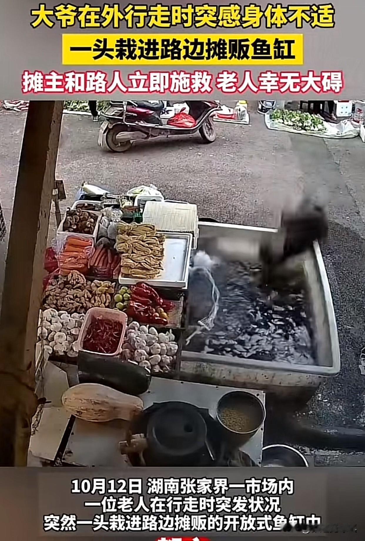 “太惊险了!”湖南张家界一位大爷在鱼摊前突然头晕,转身没站稳,直接向后倒进养鱼的水池里,呛了好几口水。卖鱼老板反应超快,立马冲过去把大爷扶了上来。 我个人觉得,大爷这种情况很可能是突然站起来,血压没跟上,导致头晕站不稳。说实话,多亏老板眼疾手快,不然后果真不敢想。 其实这件事让我想到,监控有时候真能帮大忙,既能记录现场又能还人清白。而老板伸手这一扶,暖的是人心,撑起的是咱老百姓之间互帮互助的那份情。要我说啊,社会就是需要这样随手帮一把的温暖,每个人多留份心,可能就避免了一场悲剧。 这池水溅起的不仅是水花,更是对我们每个人的提醒:关键时刻,伸出援手就是守护生命。
