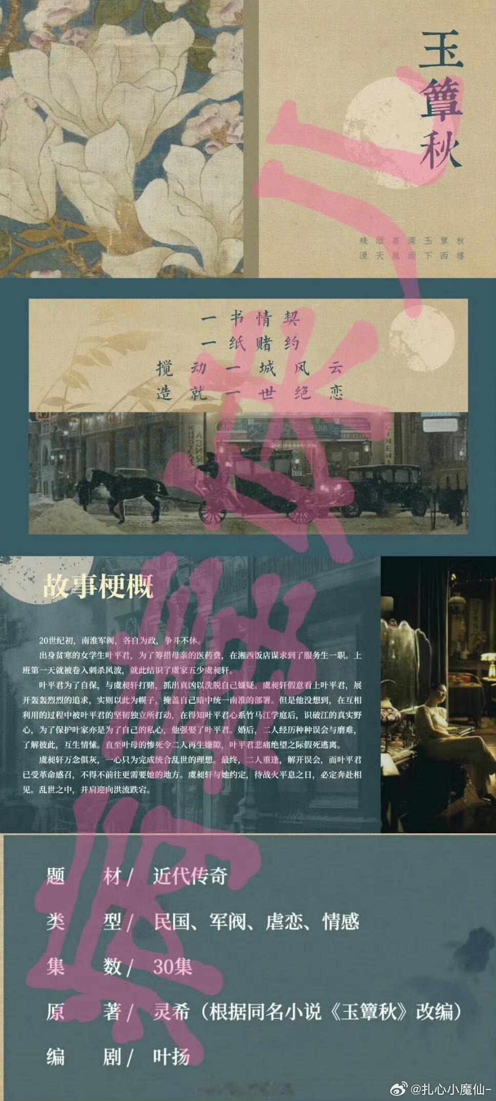 改编自灵希的同名小说,讲述贫穷女学生叶平君因为一场刺杀风波意外与虞家五少虞昶轩结识,经历几重误会波折后,两人因爱蜕变成长,在烽火年代踏浪而行的故事,拍出来绝对好看[点赞][点赞]