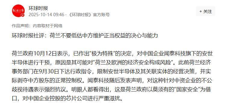 荷兰不要低估中方维护正当权益的决心与能力 荷兰政府10月12日表示,已作出“极为特殊”的决定,对中国企业闻泰科技旗下的安世半导体进行干预,原因是其可能对“荷兰及欧洲的经济安全构成风险”。此前荷兰经济事务部门在9月30日下达行政指令,限制安世半导体及其关联实体的经营决策,并实际剥夺中方股东的正常控制权。 安世半导体是闻泰科技花了 330 多亿真金白银收购的,从 2019 年完成整合到现在,生意越做越好,2024 年营收都到 147 亿了,在全球功率半导体领域排到了第三,博世、华为、苹果这些全球大公司都是它的客户,一年要生产 1000 多亿颗芯片。 这么一家给荷兰带来税收和就业的企业,怎么突然就 “威胁安全” 了?荷兰连具体风险点都说不出来,英国广播公司都忍不住说了,这事儿明显跟美国最近收紧对华限制有关。 更离谱的是荷兰法院,连庭审都没开,就直接把中方 CEO 的职权给撤了,把 99% 的股权交给第三方托管,这跟明抢有啥区别?西方平时挂在嘴边的 “契约精神”“股权至上”,到中资企业这儿全成了笑话。 再说了,安世半导体本来就是荷兰本土成长起来的企业,前身是飞利浦的半导体部门,中方收购后不仅没搞技术转移,反而砸钱升级产能,这几年累计赚了 105 亿利润,对荷兰经济是实打实的贡献。 要是真有安全风险,当初收购的时候荷兰怎么不反对?现在企业做起来了,就眼红了,用这种下三滥的手段抢控制权,这哪是监管,分明是 21 世纪的 “海盗劫掠”。 这种双标操作荷兰也不是头一回了,之前其他国家的企业收购荷兰公司,怎么没见他们这么紧张?说白了就是怕中国半导体产业起来,抢了他们的饭碗。 但荷兰显然打错了算盘,他们根本不懂中方维护正当权益的决心有多坚定。这次事儿刚出来,中国外交部 13 日就明确表态,反对这种泛化国家安全的歧视性做法,强调中方维护权益的决心坚定不移。 咱国家早就有《反外国制裁法》这把 “尚方宝剑”,之前美国打压华为、限制芯片出口的时候,咱就用这法律反击过,让不少美国企业吃了苦头。 而且这不是中资企业第一次遭遇这种不公,之前中联重科收购意大利 CIFA、三一重工收购德国普茨迈斯特,都遇到过当地政府干预,但最后靠着法律手段和政府支持,都保住了核心权益。 这次安世的事儿,闻泰科技已经明确抗议,后续肯定会通过法律途径维权,中方政府也绝不会坐视不管,荷兰想靠这种手段占便宜,门儿都没有。 更关键的是,中方现在有足够的实力跟他们掰手腕。这些年咱们在半导体领域下了大力气,自主研发的步子越走越稳。 2025 年上半年,中芯国际的产能利用率都到 92.5% 了,华虹半导体更是超负荷运转,产能利用率突破 108%。 国产芯片自给率也从去年的 35% 提升到 42%,尤其是 28 纳米以上的成熟制程,自给率都 60% 了,基本能自己满足需求。 高端领域也有突破,华为海思的 7 纳米麒麟芯片都回归了,中芯国际的 7 纳米工艺也开始小批量生产,能支撑 AI 芯片量产。 设备方面更不用说,刻蚀机、清洗设备的国产化率都上来了,上海微电子的 28 纳米光刻机年底就要小批量交付,之前被卡脖子的光刻机技术,咱们也在一步步突破。 国家还投了 3000 多亿的大基金三期,专门支持半导体设备和材料这些薄弱环节,有政策和资金托底,咱们不怕被打压。 荷兰真以为这么做能卡住中国的脖子?别忘了,中国是全球最大的半导体市场,荷兰的 ASML 公司每年要从中国赚走不少钱,他们的光刻混合气还得靠中国的华特气体供应。要是荷兰执意跟中国对着干,损害的是他们自己企业的利益。 之前美国打压华为,结果中国加快了 5G 自主建设,现在全球 5G 基站中国占了一半以上,美国企业反而丢了市场。荷兰要是重蹈覆辙,最后只能是搬起石头砸自己的脚。 国际社会也都看着呢,英国《金融时报》都直言,荷兰这举动会加剧西方和中国的高科技摩擦,彭博社也警告这会恶化中欧关系。 本来欧洲企业还想靠中国市场恢复元气,荷兰这么一搞,只会让其他国家的投资者对欧洲市场失去信心。毕竟谁也不想今天花大价钱收购企业,明天就被当地政府无理夺走控制权。 所以说,荷兰千万别低估中方的决心和能力。中方既讲法理,有《反外国制裁法》撑腰,能通过法律途径讨回公道;又有实力,半导体产业自主化的摊子已经铺开,不会因为一次干预就垮掉。 更重要的是,中国维护自身合法权益的立场从来没有动摇过,从之前反击美国贸易战,到现在应对荷兰的不公干预,每一次我们都没怂过。 荷兰要是识相,就赶紧撤销那些不合理的限制,好好跟中国企业合作;要是非要一条道走到黑,那等待他们的,必然是中方坚决的反制,到时候后悔都来不及。中方不是吓大的,想靠霸权手段欺负人,那是打错了算盘!