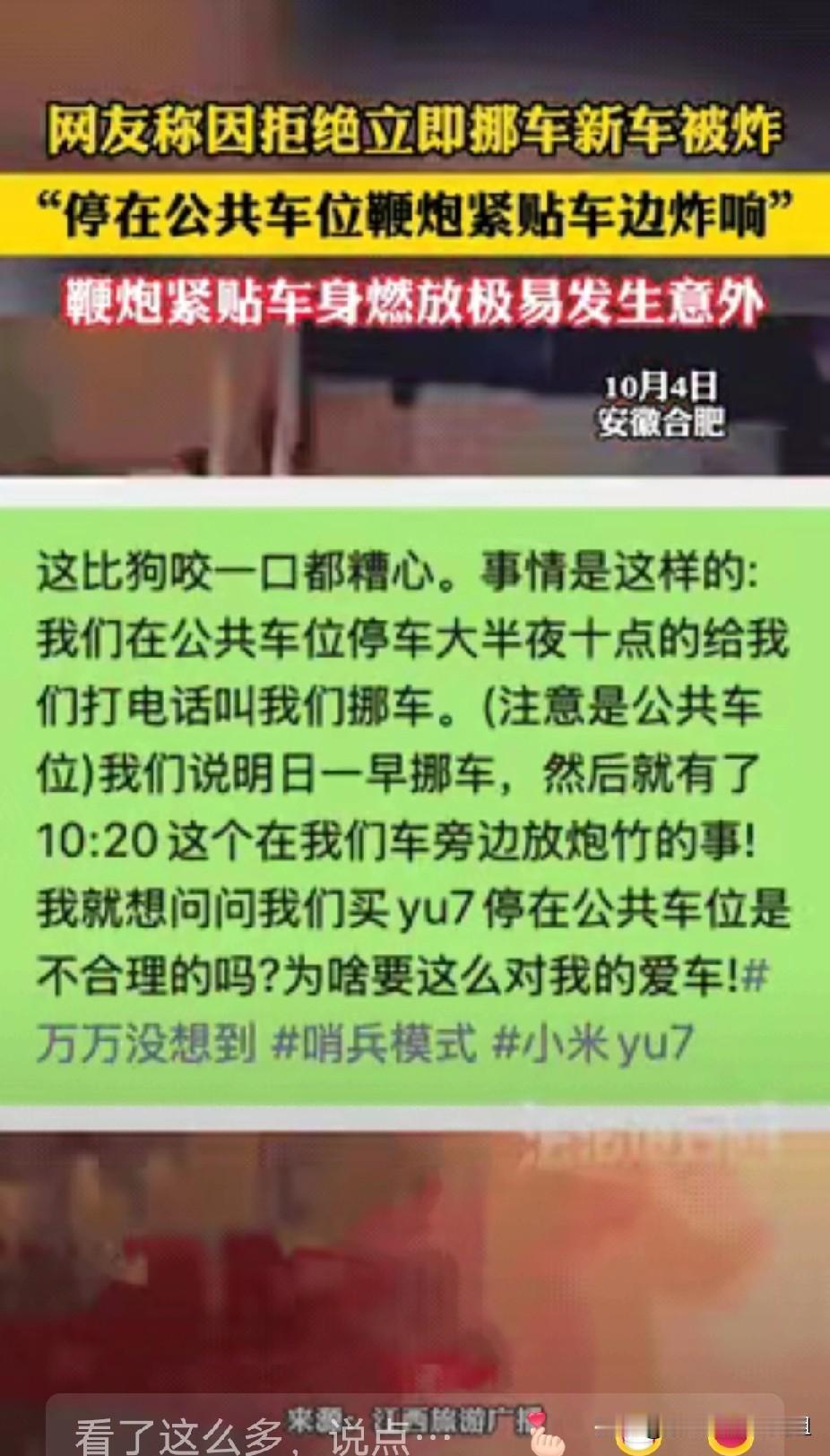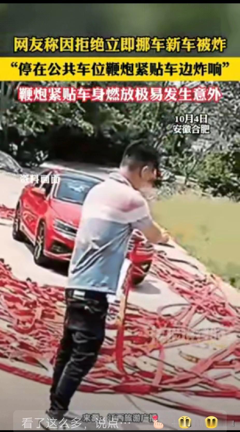 “太嚣张了!”安徽合肥,一女子新车停在路边公共停车位,夜里女子突然接到陌生电话,要求她下楼挪车。女子汽车既没挡道也没压线,因此拒绝了对方,谁知20分钟后,女子突然听到楼下传来鞭炮声,发现对方竟然故意在新车边上放炮!女子下楼找对方理论,没想到对方态度却非常豪横! 桂女士这辆还没捂热乎的新车,引擎盖和车门上多了不少被鞭炮崩坏的痕迹,看得她直心疼。事情发生在合肥,国庆前她刚提的车,10月3日晚上停在家对面马路划线的公共停车位,因为自家门口车位已经停满了。晚上10点多那个挪车电话来得有点莫名其妙,桂女士确认自己的车停得规规矩矩,完全在线内,也不妨碍任何车辆行人通行,就礼貌地回复对方等第二天早上再挪。谁知短短二十分钟后,鞭炮声就在她车边炸响了。 桂女士听到鞭炮声同时收到车辆哨兵模式警报,冲下楼正看到一名女子在她车旁收拾鞭炮残骸。新车漆面已经留下多处灼伤和划痕,维修定损要1000多元。民警到场调取监控,确认燃放鞭炮者就是要求挪车的女子,但对方态度强硬,不仅拒绝道歉赔偿,甚至在现场表现得十分“豪横”。 这件事在网上引发热议,有网友一针见血:公共车位是大家伙的,又不是谁家私人领地,凭什么深更半夜逼人挪车?放鞭炮报复的行为,简直是把“我不好过你也别想好过”的心态演绎得淋漓尽致。 从法律角度看,放鞭炮女子的行为已经涉嫌违法。故意损毁公私财物,根据《治安管理处罚法》可能面临五到十五日拘留及罚款。若定损金额达到刑事立案标准,后果更严重。《民法典》也明确规定,过错侵害他人民事权益应当承担侵权责任。桂女士停车合规合法,没有任何过错,而对方采取燃放鞭炮的过激方式,明显存在主观过错,需要承担全部赔偿责任。 公共停车位纠纷近年来并不少见,解决方式却大相径庭。有的地方法院通过诉前调解成功化解停车费纠纷,也有派出所运用“警法联调”机制妥善处理车位冲突。相比这些理性解决问题的案例,合肥这起事件中放鞭炮的做法显然突破了文明社会的底线。有景区民警处理停车纠纷时说过,假期出来玩就图个开心,何必因小失大——这话放在日常生活中同样适用。 桂女士已经收集了监控录像、定损单和报警记录等证据,准备通过法律途径维权。她较真的不是那一千多块钱维修费,而是要让对方明白公共资源不是私人领地,不能因为一时不顺心就肆意妄为。 这件事背后折射出的是公共空间使用规则意识的缺失。当有人理直气壮地认为“我看不惯就可以破坏”,当守法公民的合法权益需要“咽不下这口气”才能维护,我们该反思的是:如何让每个人都能尊重规则,如何让冲动的人学会克制?公共停车位是面镜子,照出有些人把公共资源当私产的霸道,也照出法治观念在个别角落的缺失。 各位读者你们怎么看?欢迎在评论区讨论。