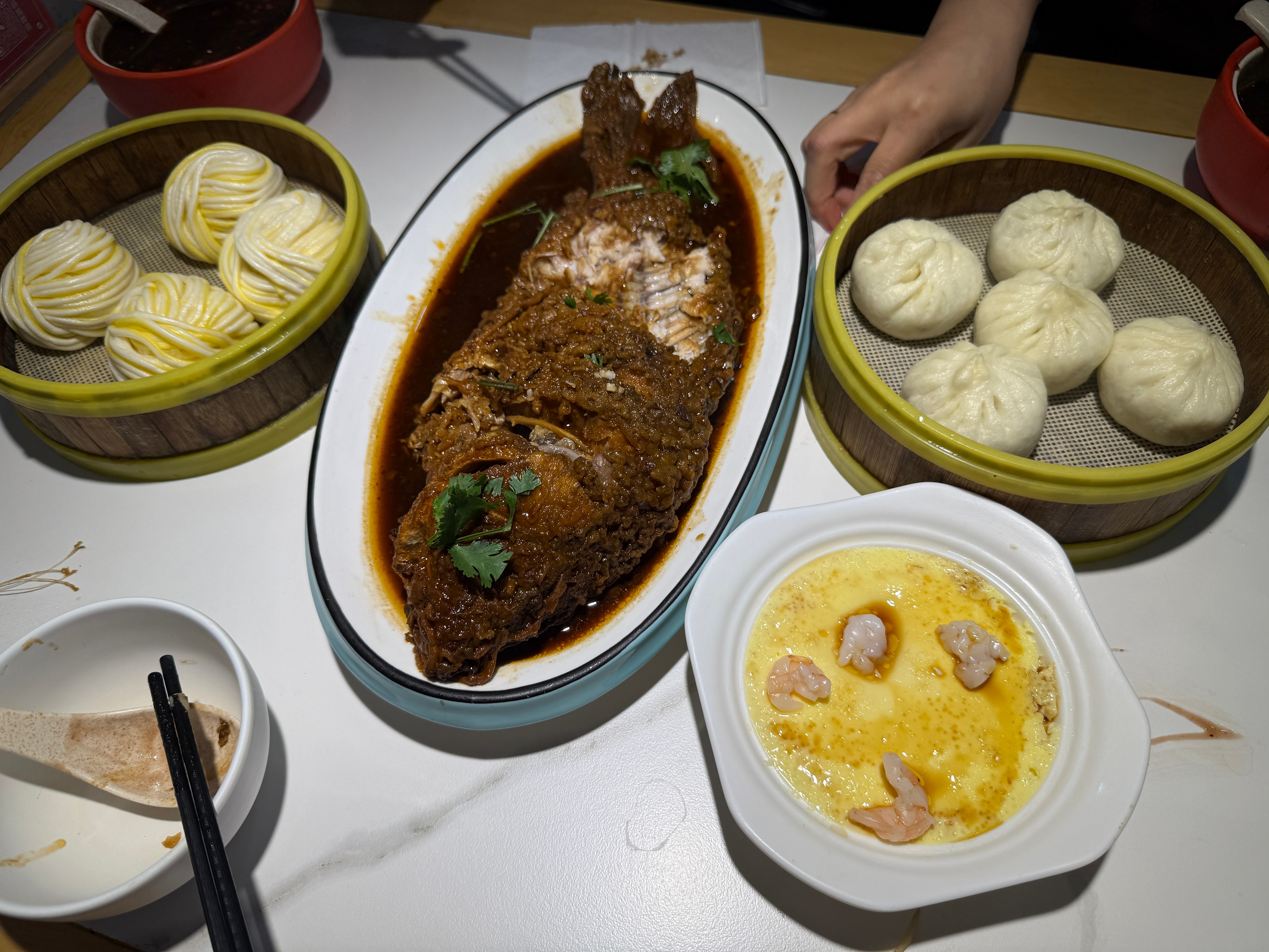 这个鱼你猜多少钱?20几元,关键还很好吃,刺也很明显,这一顿下来吃美了,他们的特色是这个八宝粥真的好喝[送花花]花卷和包子,还有蒸鸡蛋,我都很喜欢[求关注]