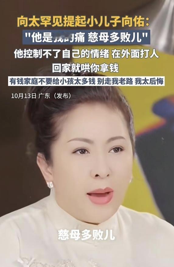 太后悔了,慈母多败儿!有钱家庭不能给小孩太多钱,一定要明白严格教育的重要性,不然会宠坏孩子。 65岁的向太陈岚谈及小儿子向佑时,直言太后悔,她把十几岁的小儿子送到英国读书时,小儿子每个月话费都要用2万,但是从来不给家里打电话,反而大儿子向佐每个月才两千,电话都是打给她的。 而小儿子只有犯错要钱时才会哄她,她当时总想着是自己的儿子,一次次原谅他,结果后来向佑控制不了自己的情绪,在外面打人,还嚣张的对被打者说“你知道我爸爸是谁吗?”,向太才明白自己一直以来的原谅就是放纵,自己不该给小儿子太多钱,让他以为钱来得太轻易,宠坏了他,现在她已经管不住向佑了。 可见,家长教育孩子一定要从小抓起,严格教育,不然可能会成为下一个向太,后悔半生。