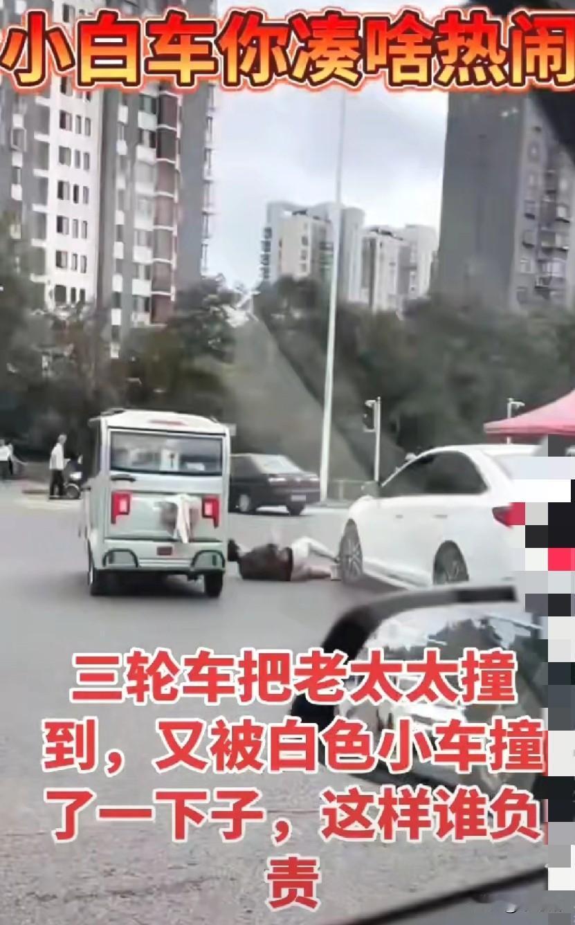 这是非撞不可了吗?三轮撞完,小车撞,就说这老奶奶怎么这么倒霉了。 在一段不知名的路中间,一辆三轮车不小心把一老人撞倒在地,大家正在感叹这三轮车,这下哦豁了,撞到老年人可摊上大事了的时候。 突然一辆白色小轿车,“框”一声,又来补了一刀,你说这算什么事? 看这三轮车和老人的距离,应该只是碰撞,老人被吓来跌坐在地,还有精气神的,这不正坐在地上等着施救呢。 结果突然来个小白车,开的也算缓慢,怎么突然把人撞趴下,这是看三轮车保险不够赔,你再来拼一刀吗?要不干嘛非凑这热闹啊。 看来这一天老奶奶被撞,是横竖躲不过去了呗? (图片来自网络视频)