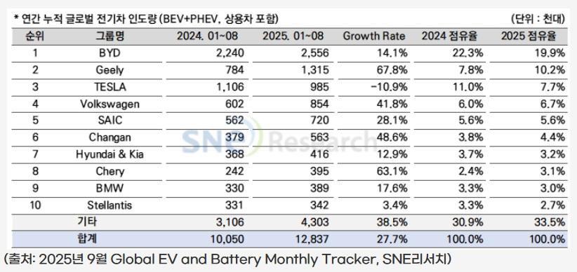 【全球电动车销量排名,比亚迪第一,吉利第二,特斯拉第三!】 今年 1-8 月,全球各国登记的电动汽车数量约为 1283.7 万辆,较去年同期的 1005 万辆增长约 27.7%。 中国比亚迪截至 8 月的销量达约 255.6 万辆,同比增长 14.1%,稳居全球第一(市场占有率 19.9%)。 第二名由销量 131.5 万辆的中国吉利汽车集团占据,其销量同比大幅增长 67.8%,市场占有率为 10.2%。特斯拉销量同比下降 10.9%,以 98.5 万辆跌至第三名(市场占有率 7.7%)。 第四名是大众集团,销量 85.4 万辆(同比增长 41.8%);第五名是上汽集团,销量 72 万辆(同比增长 28.1%);现代汽车・起亚以 41.6 万辆(同比增长 12.9%)的销量位居第七。 外界评价称,比亚迪通过在欧洲和东南亚新建及扩建工厂,灵活应对关税与补贴政策变化,同时凭借价格竞争力和技术实力,不断提升品牌认知度与市场存在感。 相反,特斯拉在欧洲、北美、中国等主要市场整体表现低迷。其主力车型 Model Y 与 Model 3 销量疲软,拖累了整体业绩,其中 Model Y 在全球范围内销量同比下降 11.2%。旗舰轿车 Model S 与旗舰 SUV Model X 的销量更是分别骤降 59.6% 和 44.2%。 从地区来看,中国市场累计销量达 809.4 万辆,同比增长 29.0%,占据全球 62.4% 的市场份额;欧洲市场销量增长 32.0%,达 256.1 万辆,市场占有率为 19.9%;北美市场销量仅增长 2.9%,为 120.9 万辆,市场占有率降至 9.4%。【来自懂车帝车友圈】